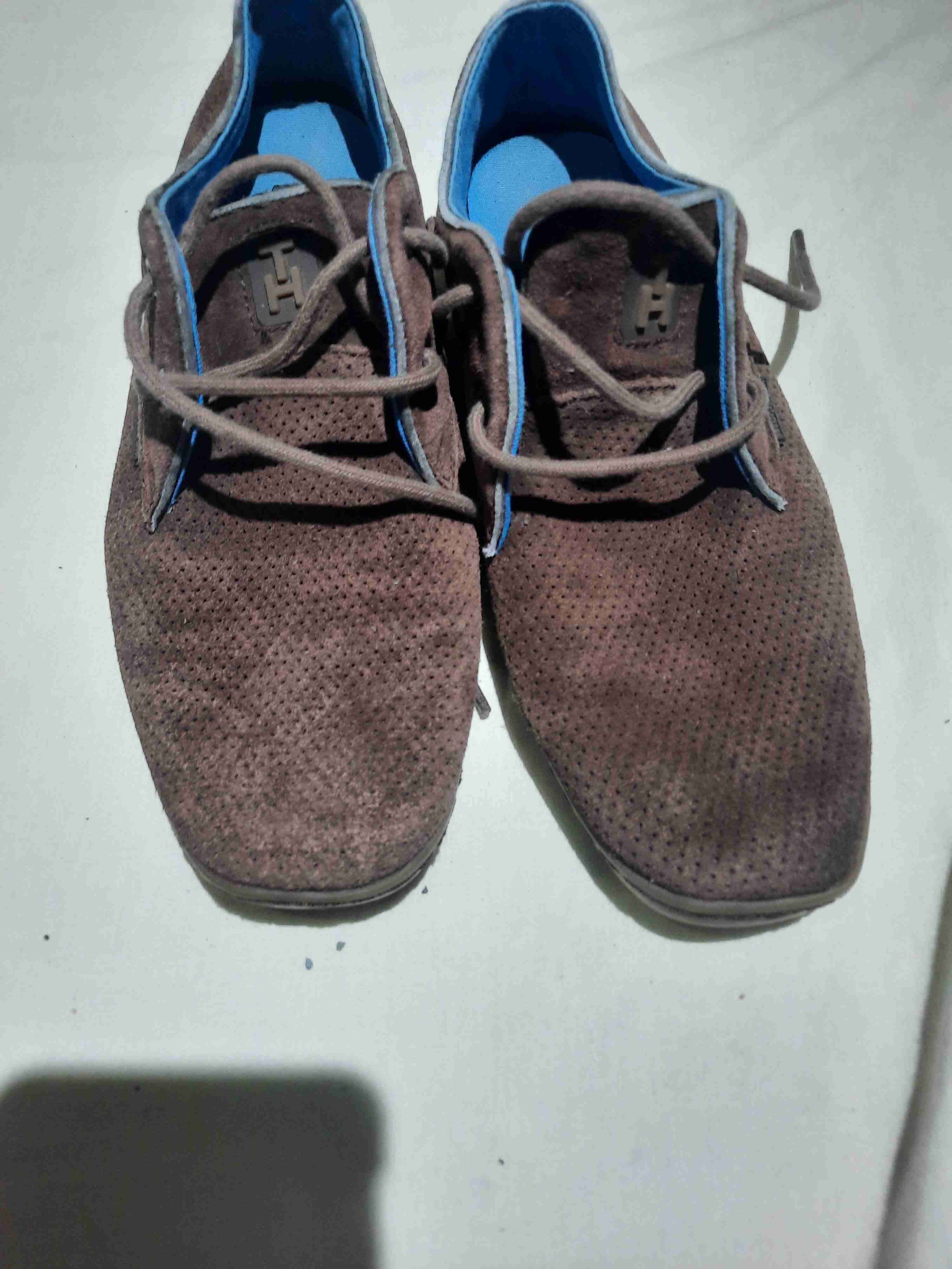 Zapatos de gamuza café con detalle azul, en buen estado y cómodos para uso diario. Ideales para un look casual.Tomy