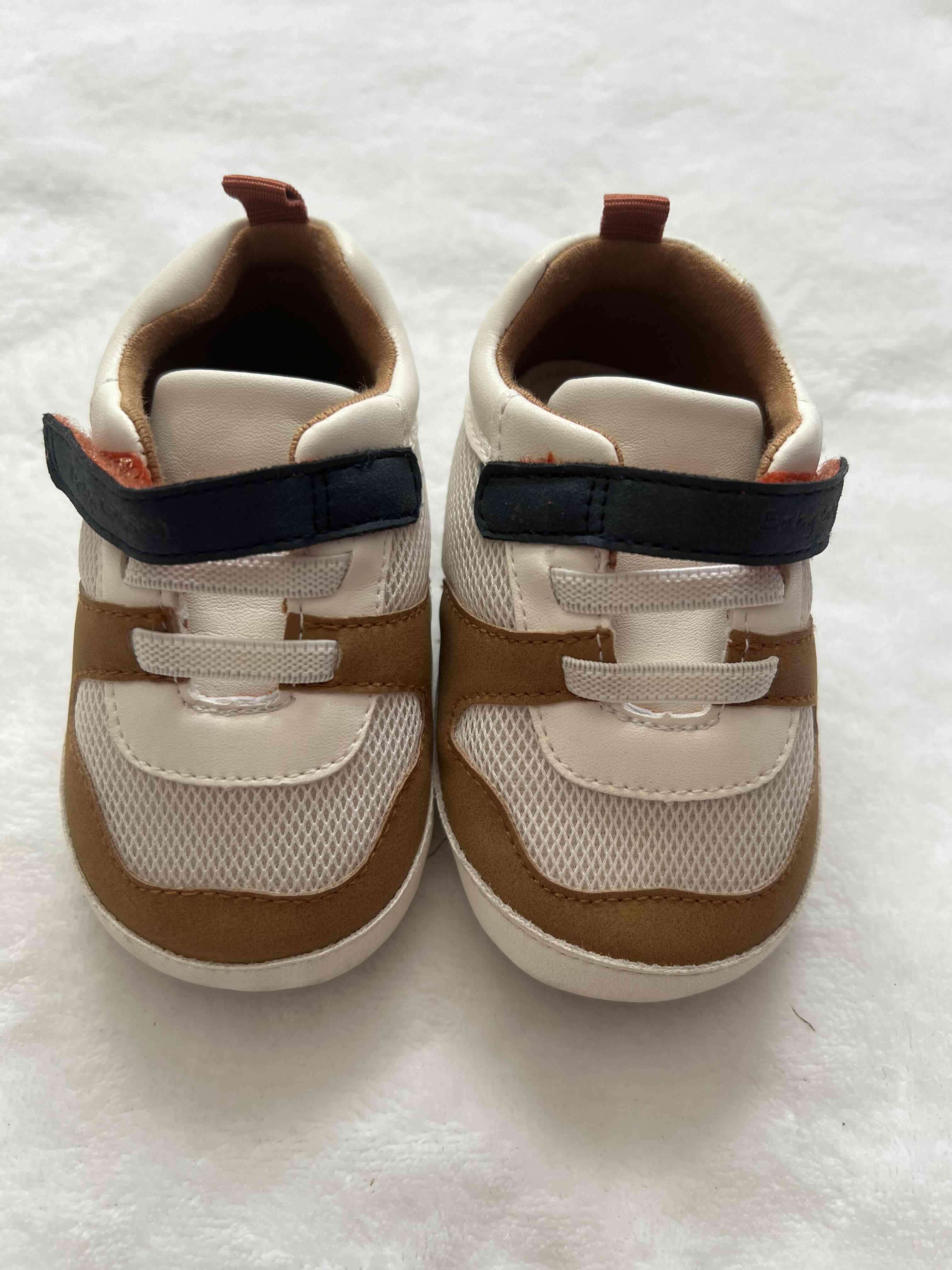 Zapatillas de bebé en color blanco y marrón, perfectas para el día a día. En buen estado, con cierre de velcro fácil de usar.