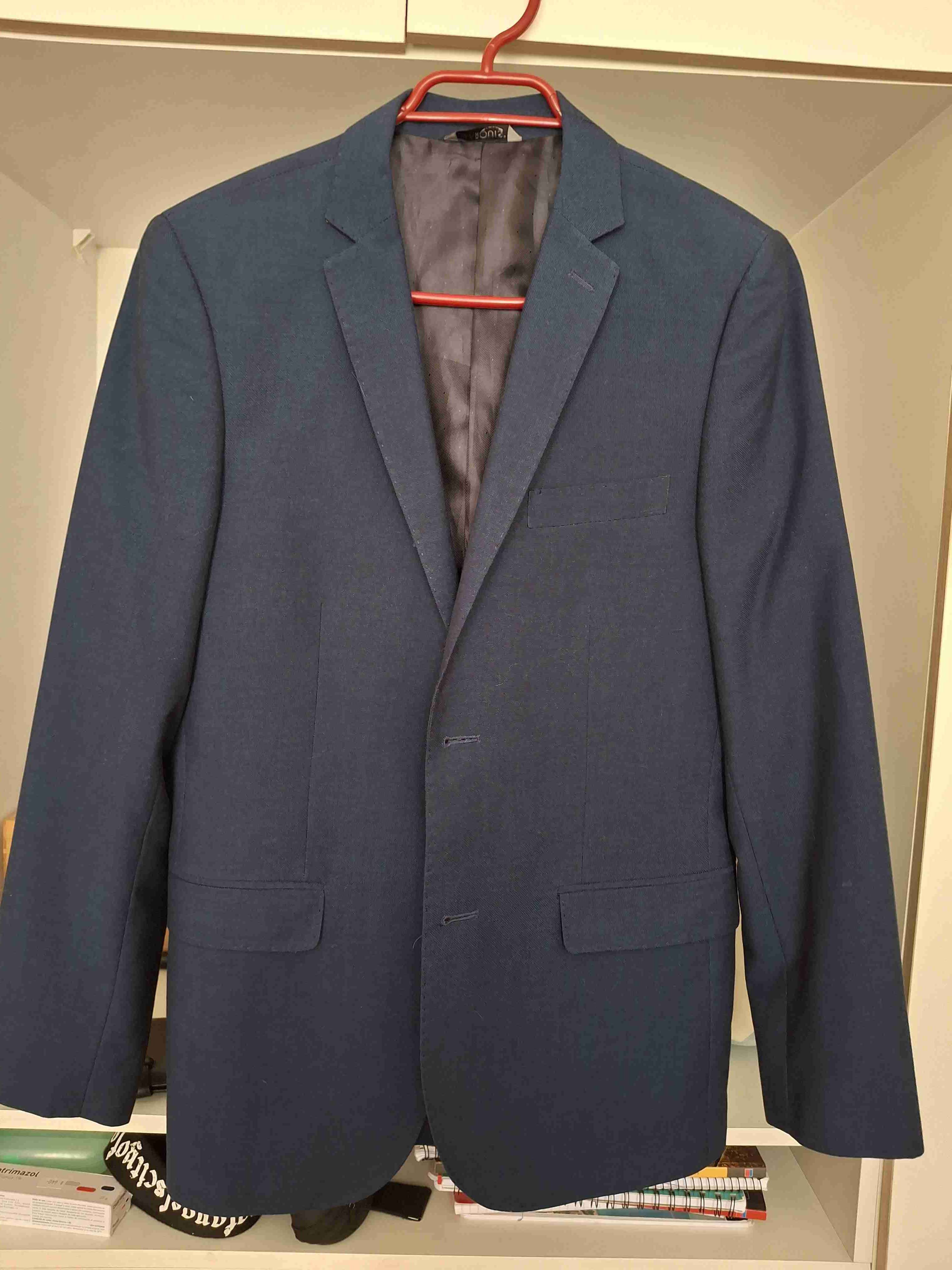 Blazer elegante de color azul marino, ideal para ocasiones formales. En buen estado, con leves signos de uso.