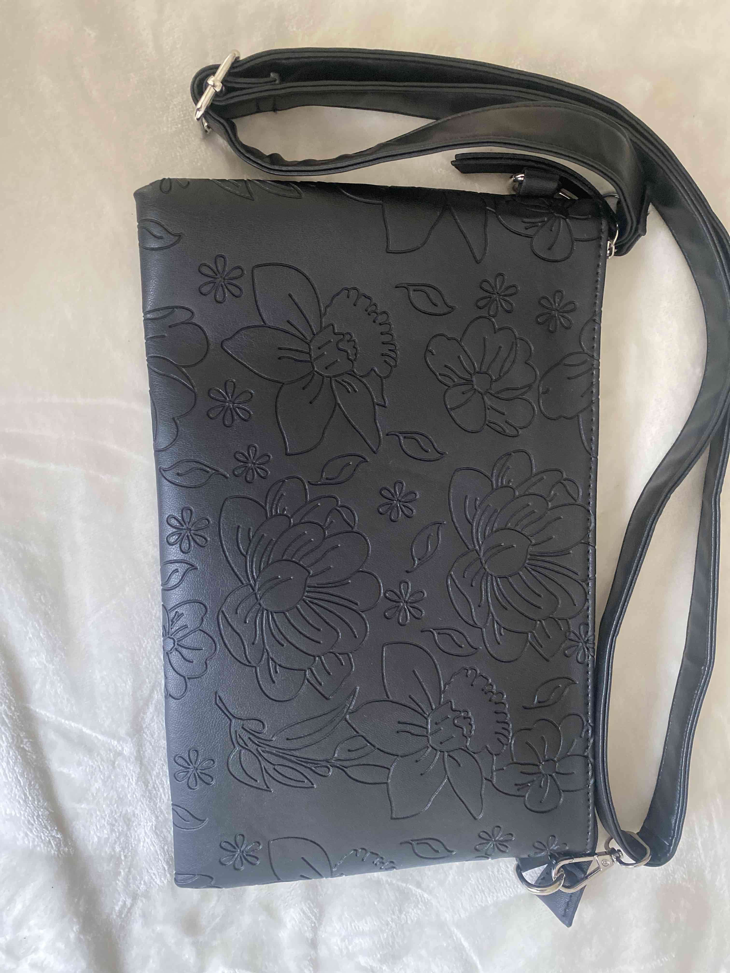 Cartera elegante color negro con diseño floral en relieve. Ideal para salidas casuales. En buen estado. Nuevo , sin uso . Lamentablemente se le saco la etiqueta