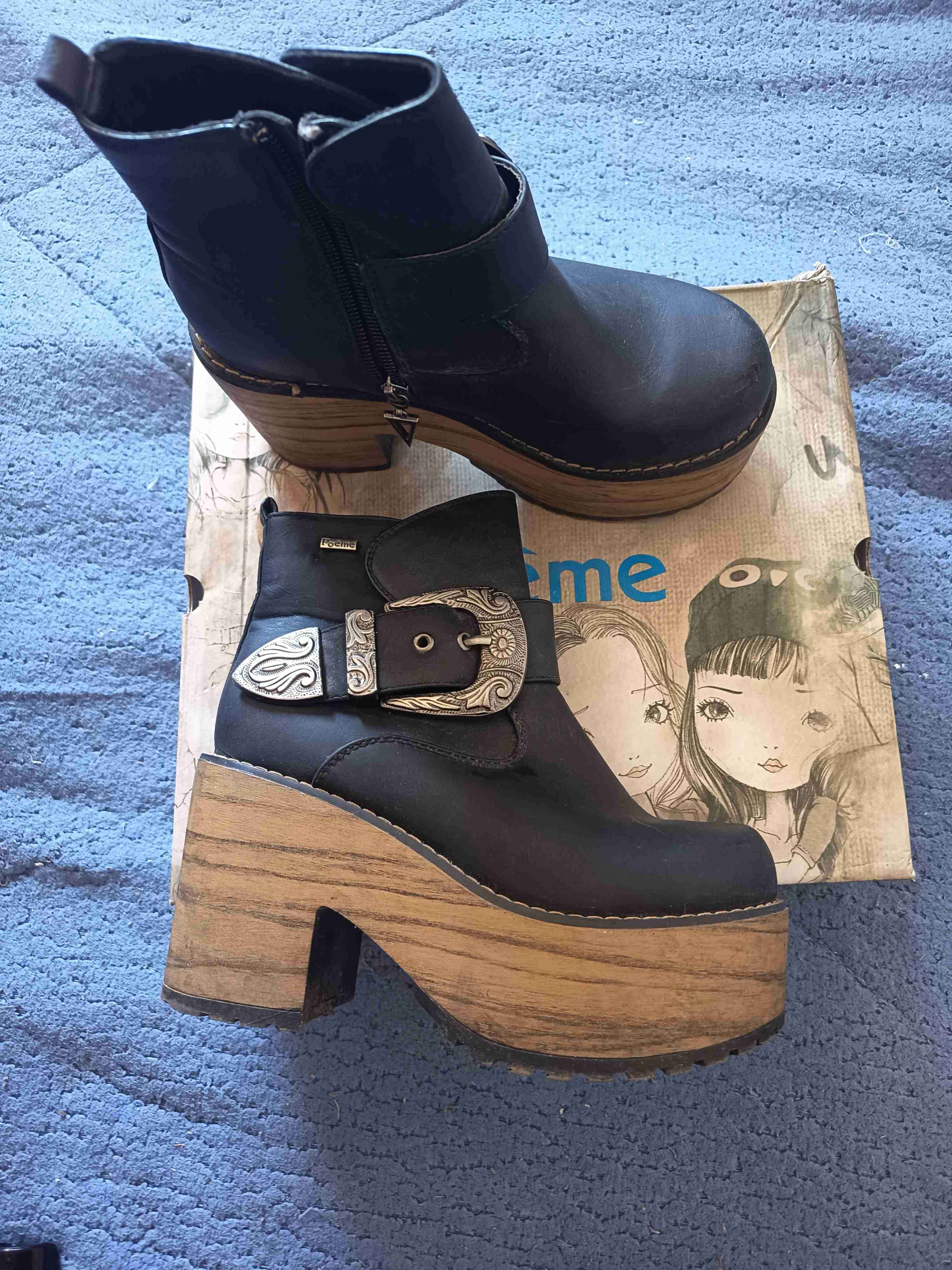 Elegantes botines de cuero negro con tacón de madera y detalle de hebilla decorativa. Perfectos para un look casual y moderno.
