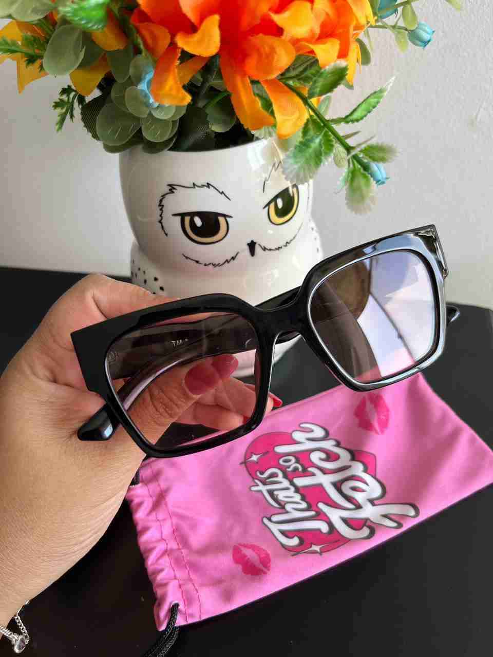 Gafas negras con diseño moderno, incluidas en funda rosa. Perfectas para un look elegante y casual.