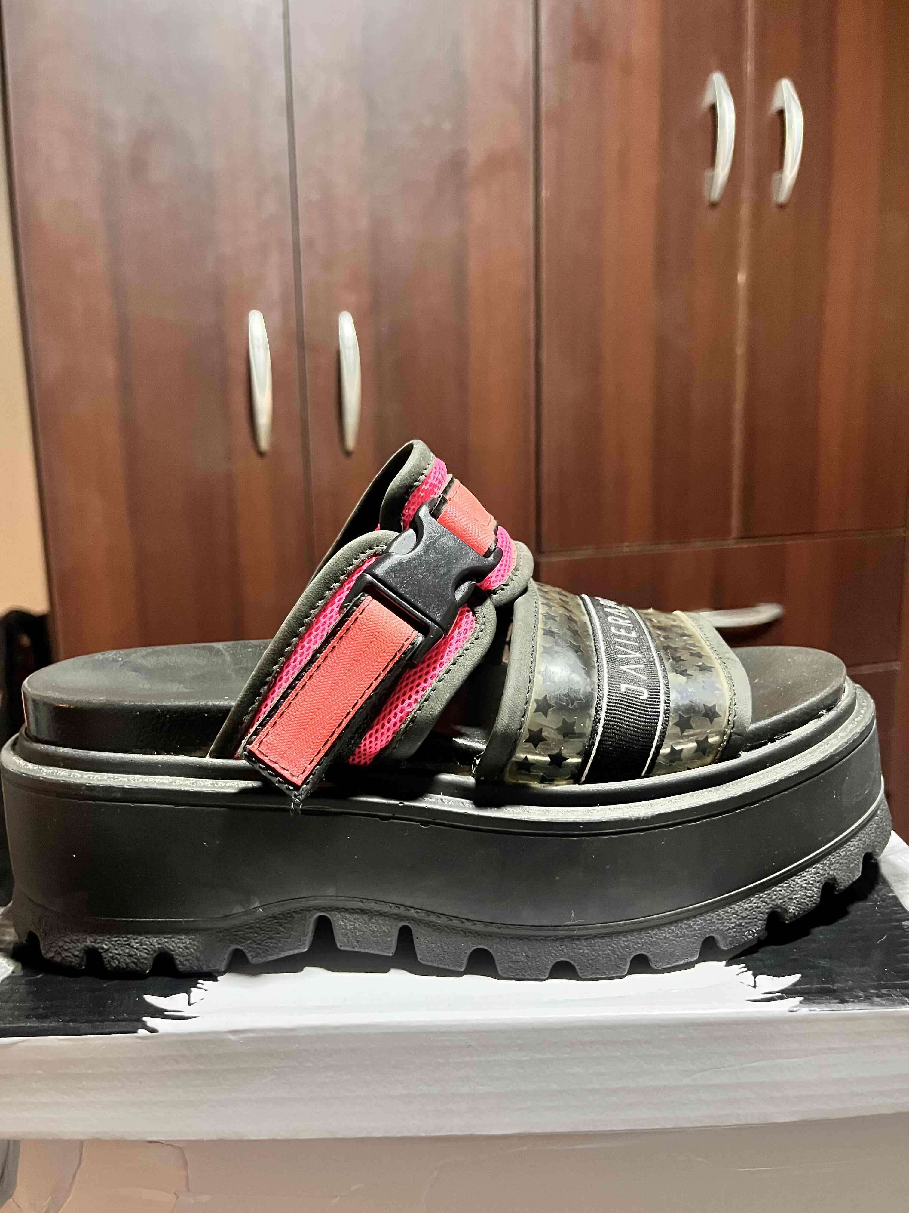 Sandalias negras con detalles rojos y plataforma gruesa. Perfectas para un estilo casual y cómodo. Se ven en buen estado general.