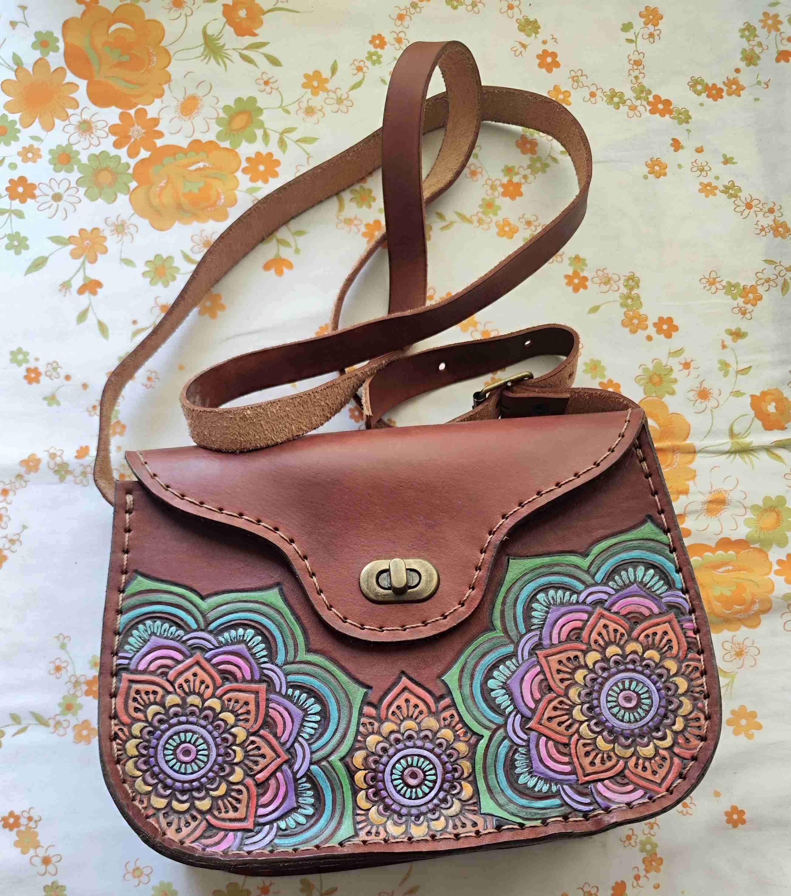 Cartera de cuero mendocino, con diseño pintado a mano ideal para estilo bohemio. Buen estado, nunca usada.. Perfecta para ocasiones casuales.