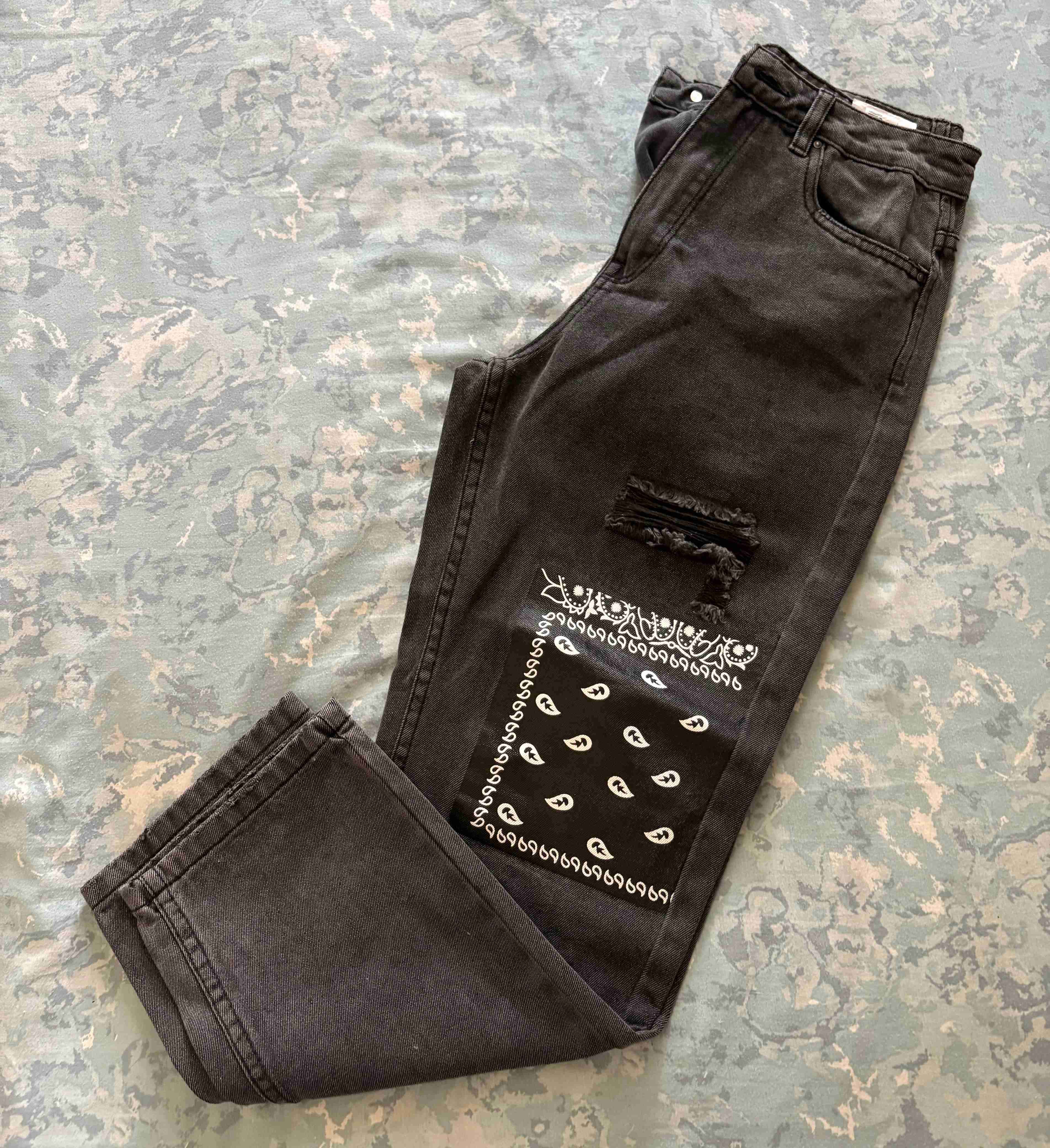 Jeans negros con diseño gráfico en buen estado, estilo moderno y cómodo. Perfectos para un look casual.