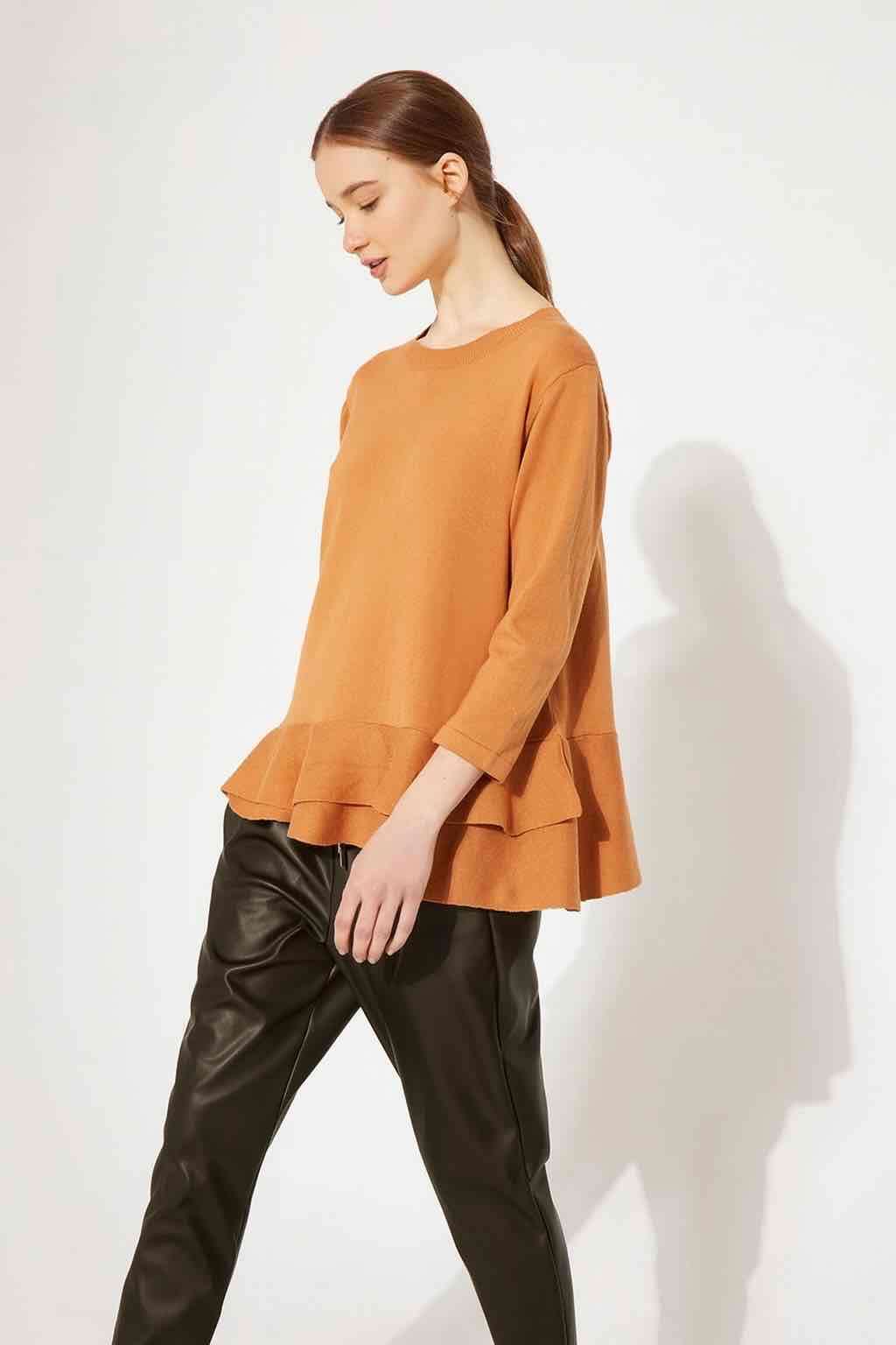 sweater color camel, nuevo con etiqueta de la marca jazmin chebar, con volantes en la parte baja que le aporta mucho movimiento, con manga 3/4, es de hilado fino, corresponde a la talla s (talla 1 de la marca), pero sirve perfectamente para talla m, ya que es de un tejido muy suave y elástico. sus medidas son: ancho de hombros son 38 cm, contorno de busto 90 cm sin estirar, el largo de la prenda es de 57 cm, largo de manga 44 cm. Precio referencial: $180.000