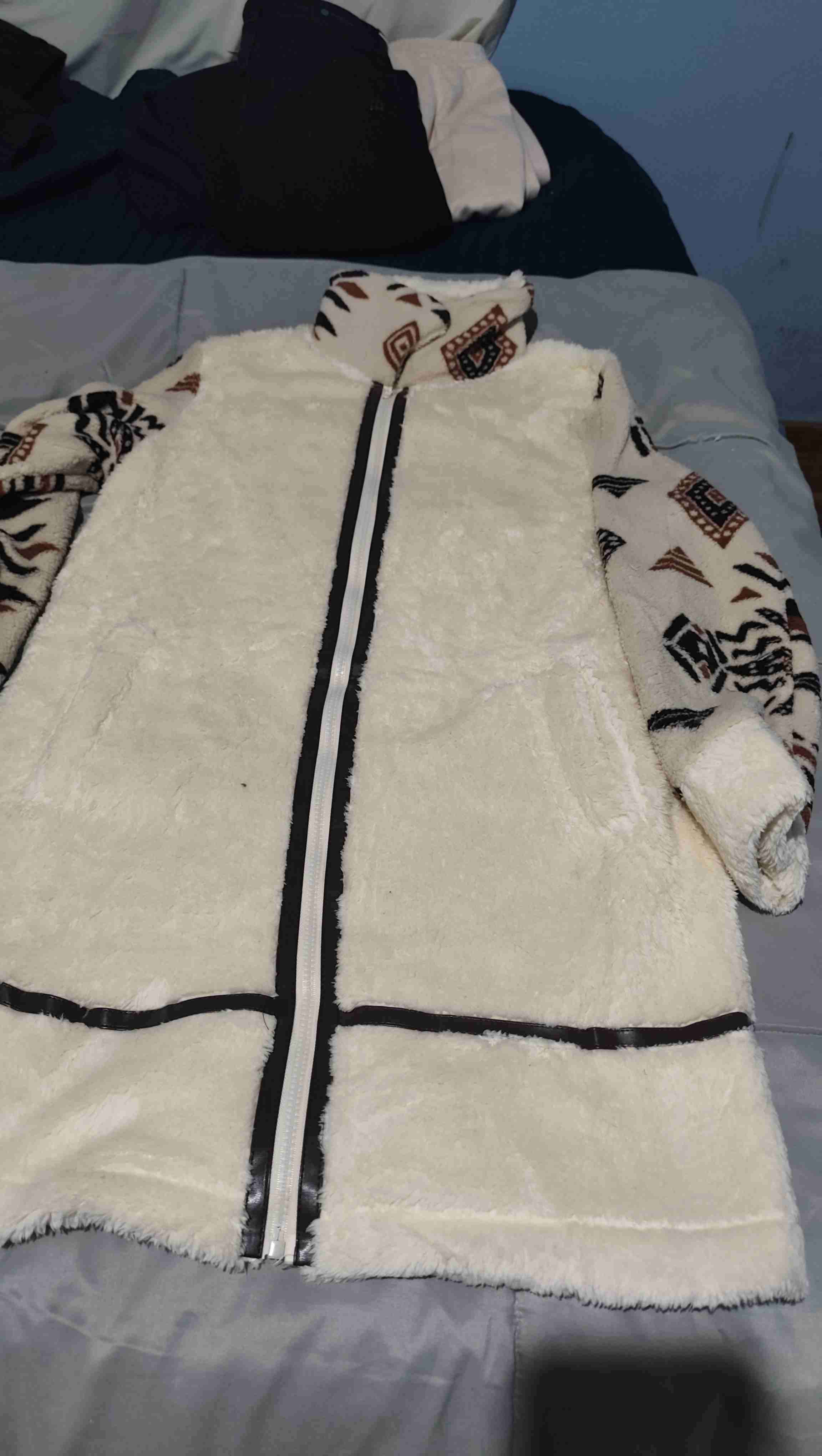 Abrigo largo de forro polar color beige con diseño étnico en las mangas. Ideal para otoño e invierno. Detalles de cuero