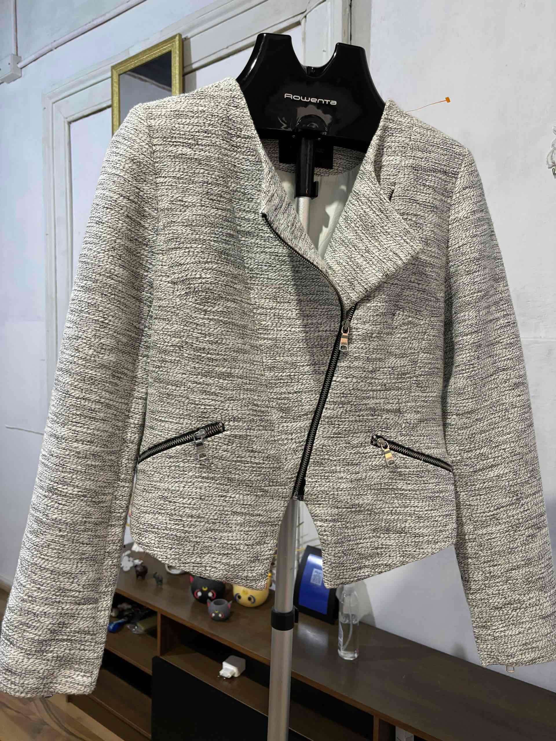 Elegante chaqueta gris con cierre frontal y dos bolsillos. Ideal para el uso diario o ocasiones especiales.