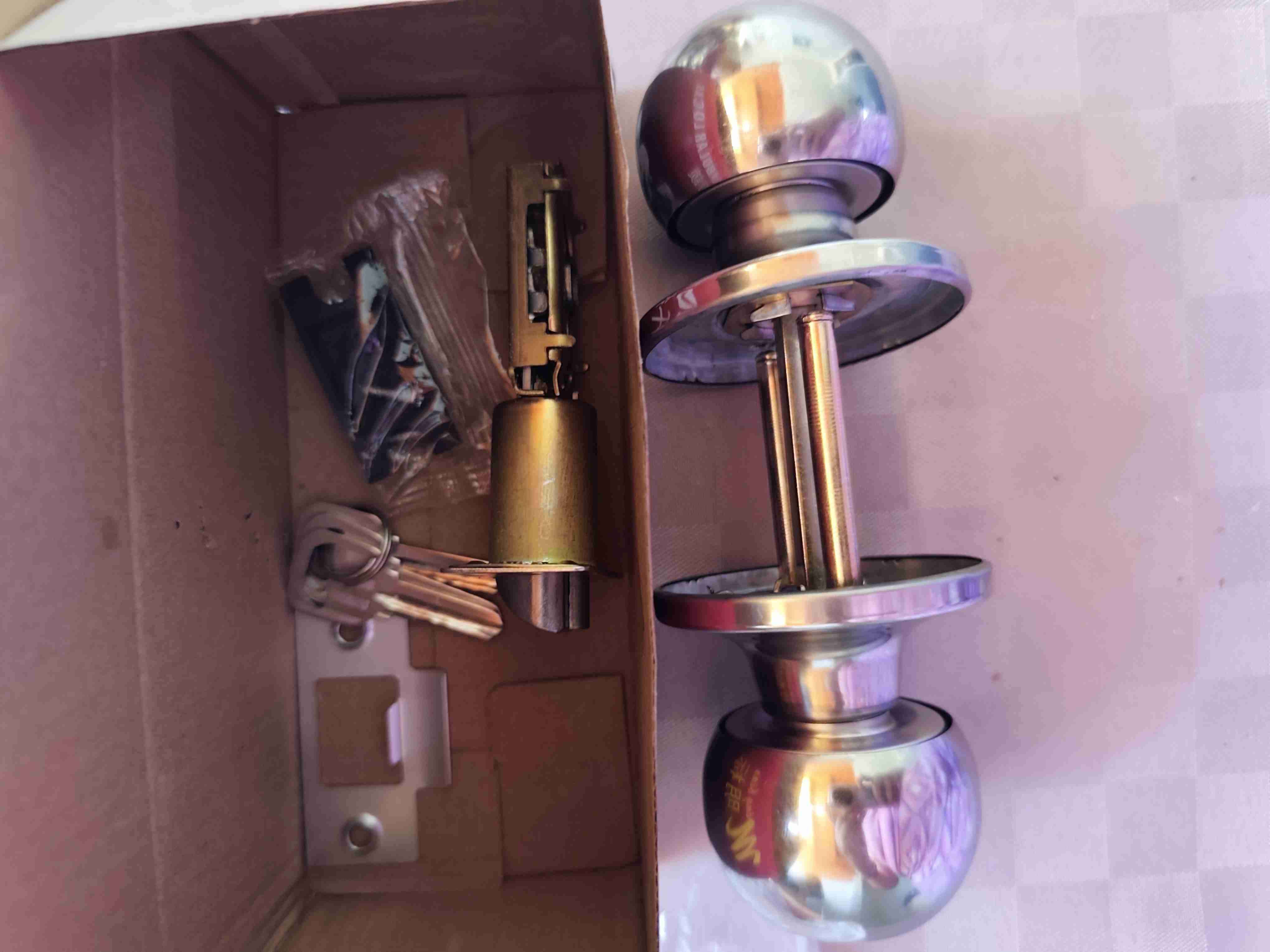 Cerradura de puerta con diseño metálico, incluye llaves y piezas. Ideal para asegurar tu hogar.