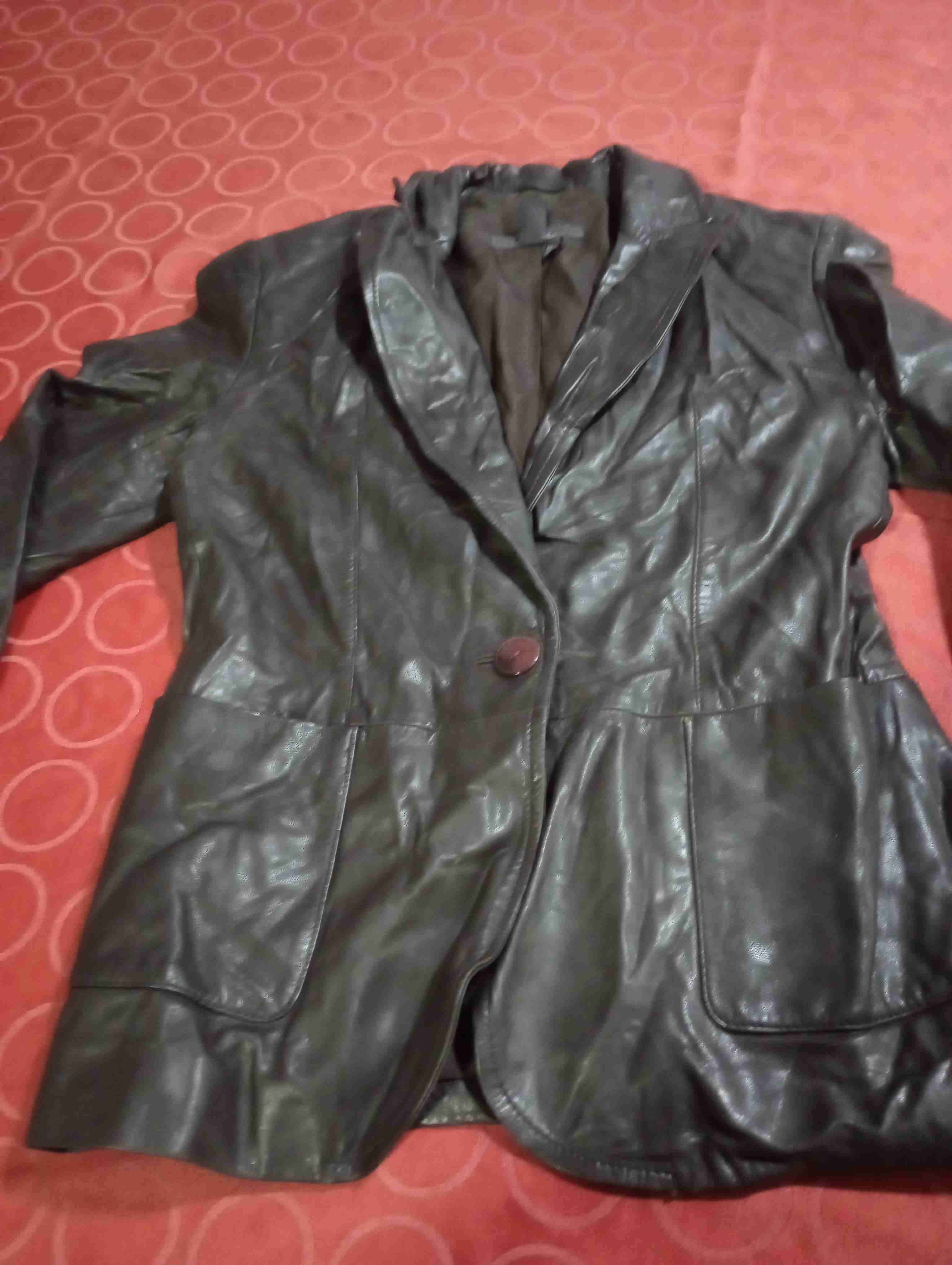 Elegante blazer de cuero en color negro, ideal para ocasiones formales. En buen estado, con leves signos de uso.