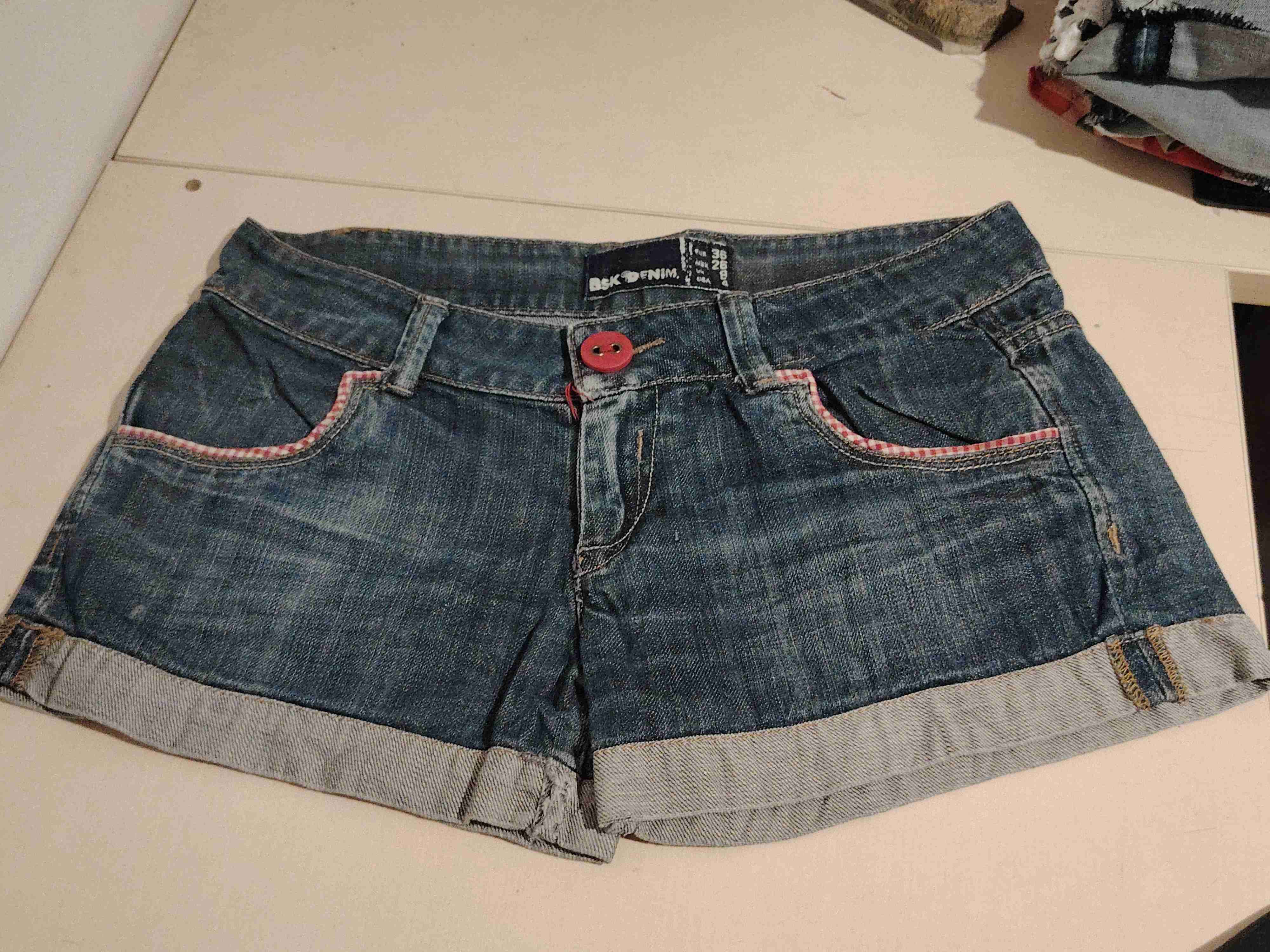Shorts de mezclilla azul con botón rojo. Ideal para verano, en buen estado.