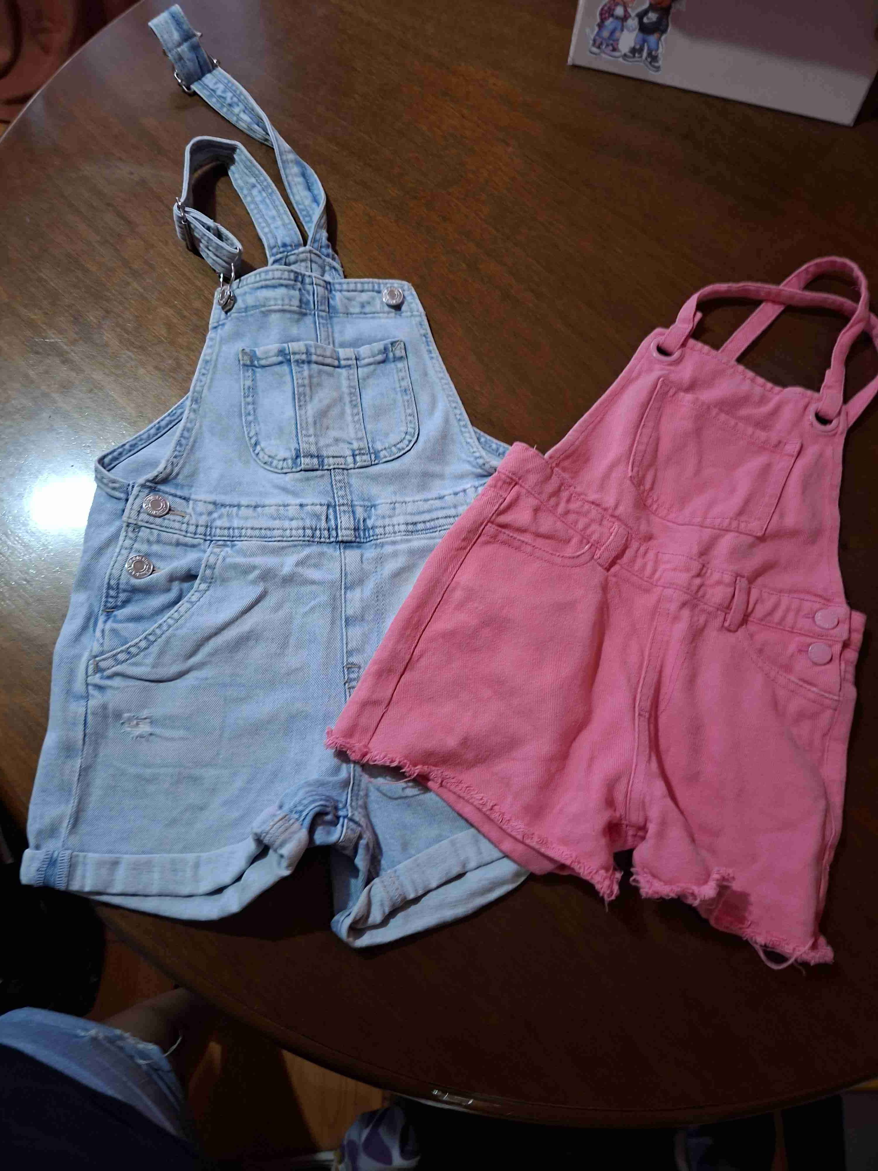 Jardineras cortas para niña, una de mezclilla clara y otra rosada. Ideales para el verano, en buen estado general.