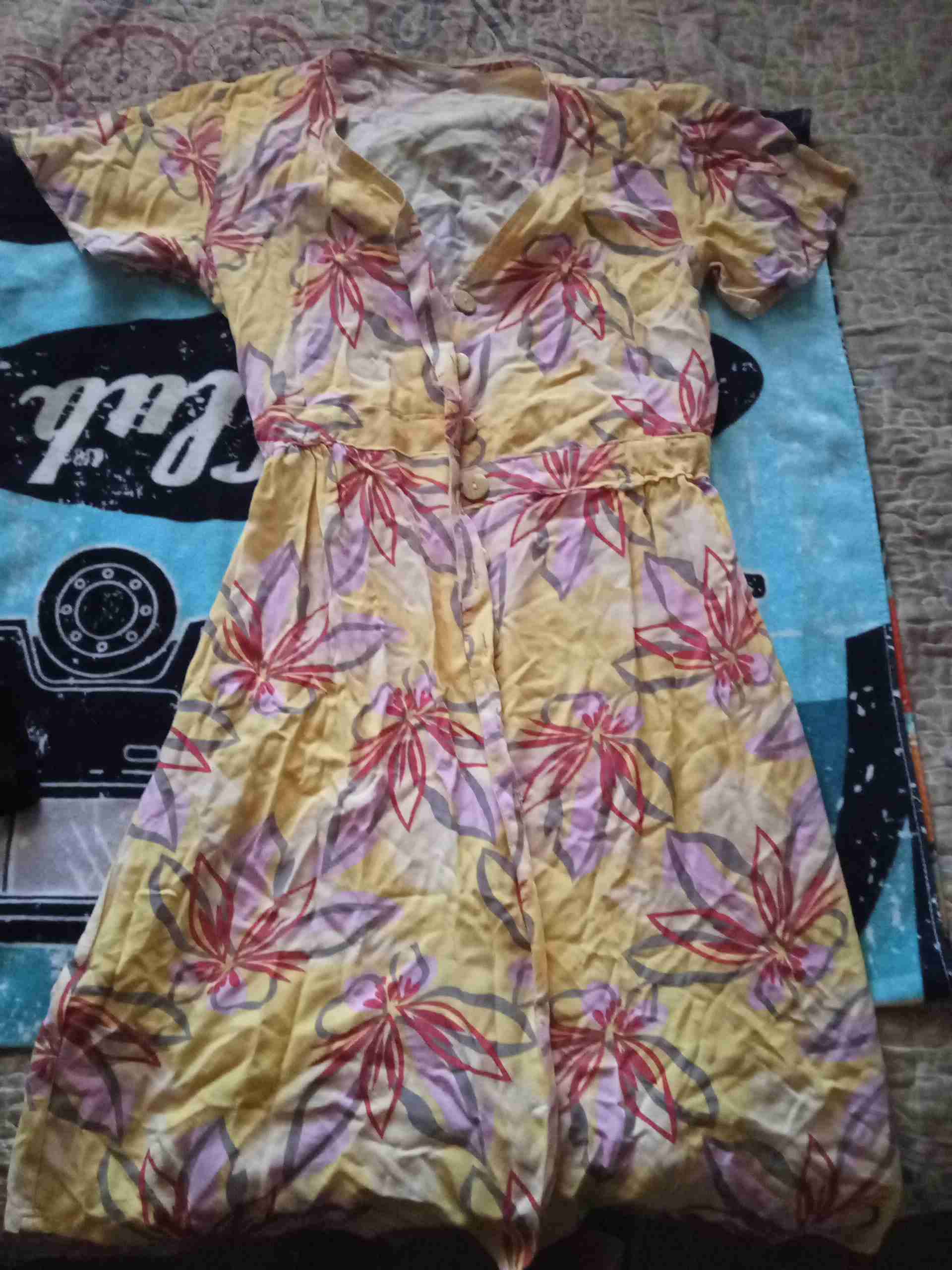 Vestido con estampado floral en tonos amarillos y rosas, ideal para el verano. En buen estado general, cómodo y ligero.