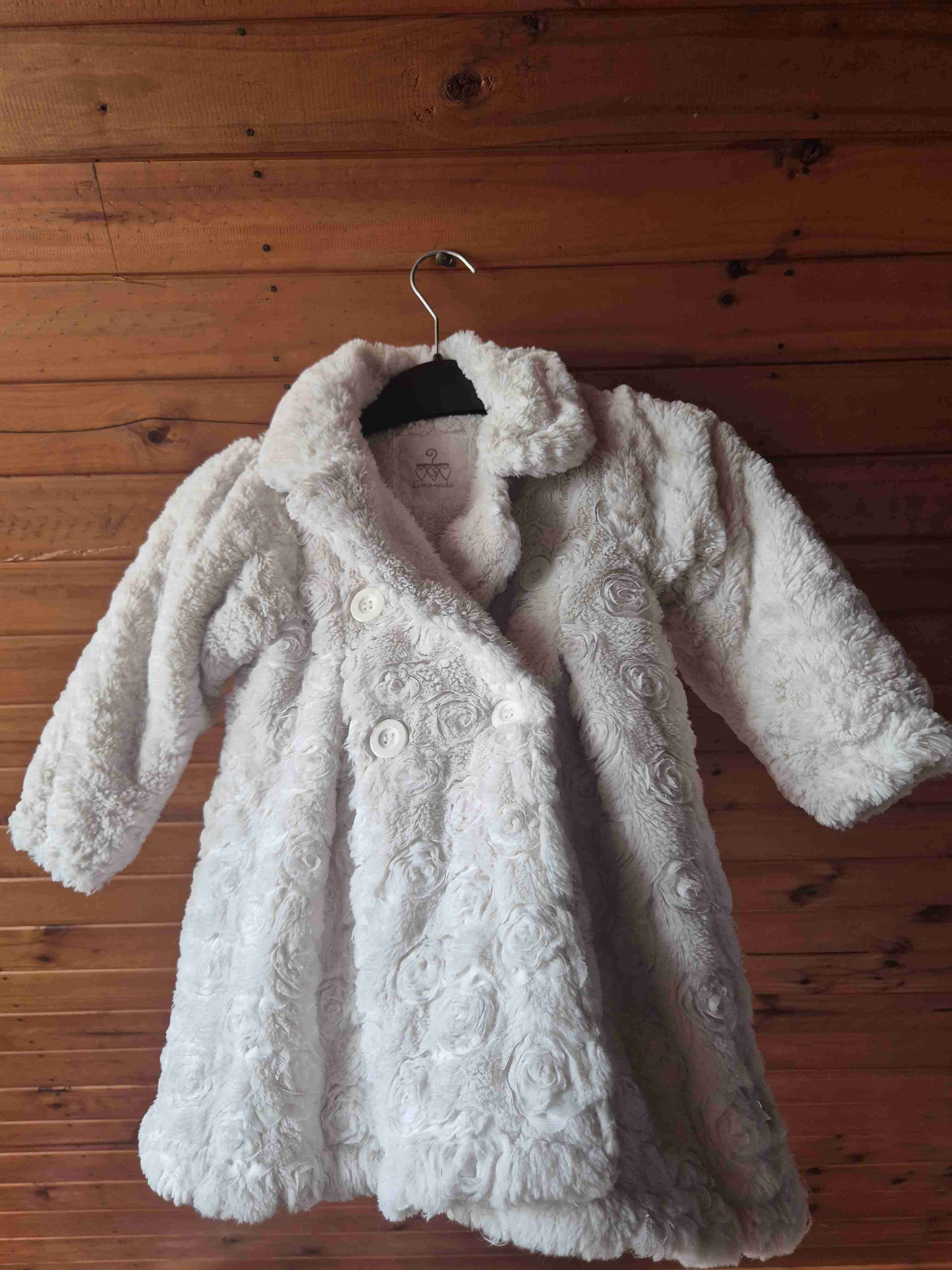 Abrigo de pelo blanco con diseño de rosas, perfecto para días fríos. En buen estado, ideal para ocasiones especiales.