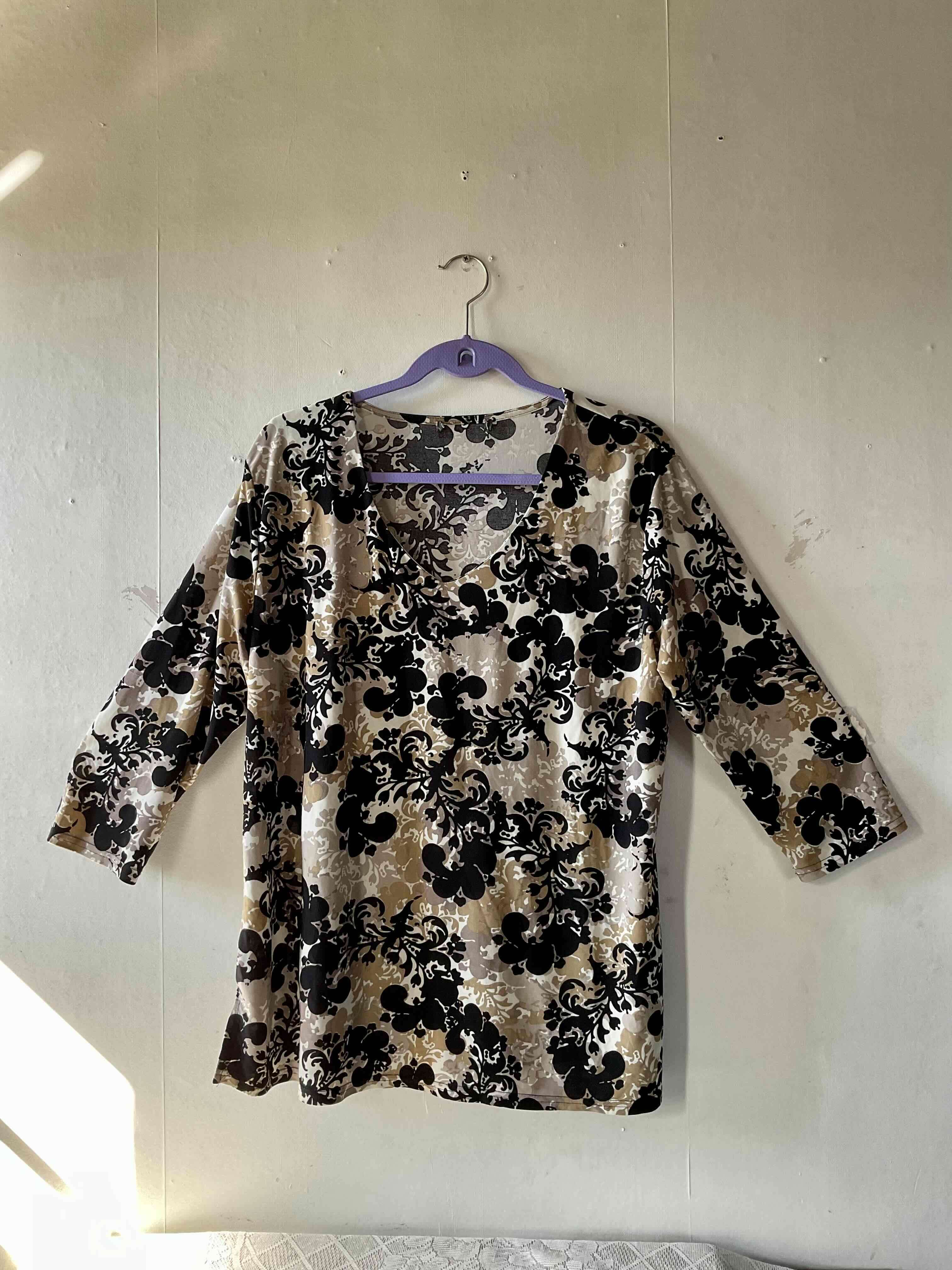 Blusa con diseño floral en tonos negros y beige. Buen estado, ideal para uso diario o casual.