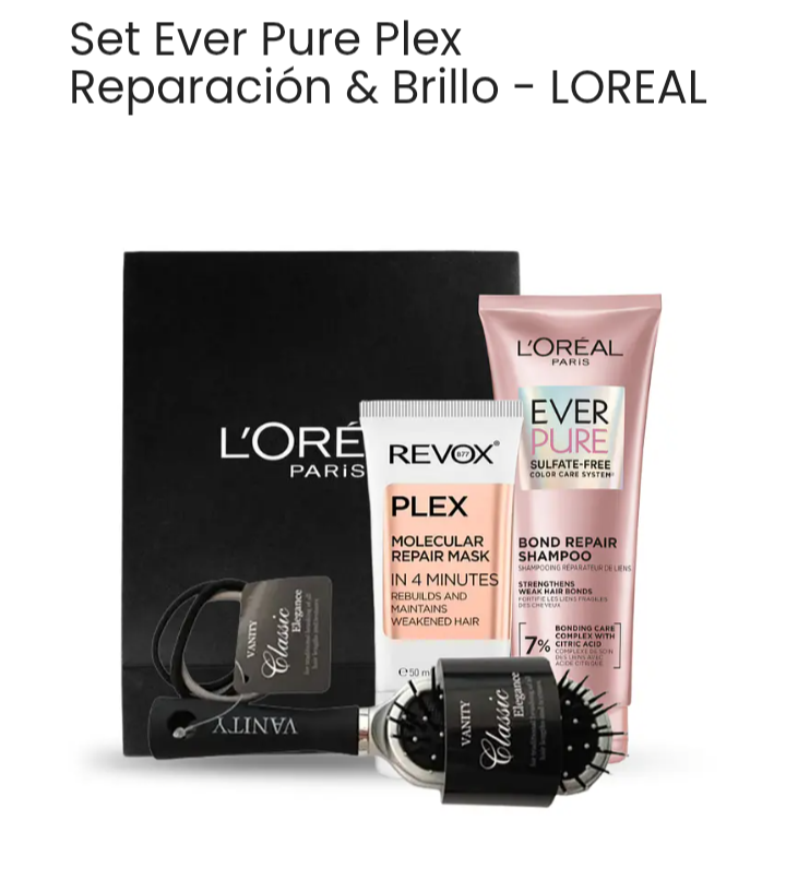 Set de cuidado del cabello para reparación y brillo. Incluye shampoo y mascarilla. Ideal para cabello dañado.