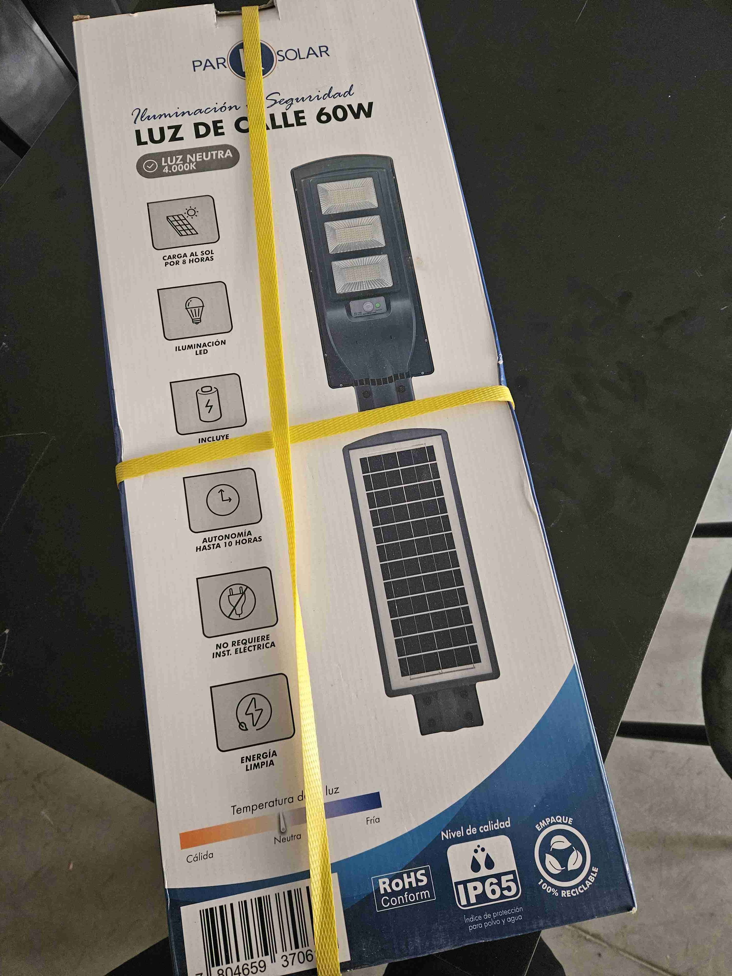 Luz de calle con panel solar, ideal para iluminación exterior. Funciona 8 horas con carga solar. Modelo nuevo, empacado.
