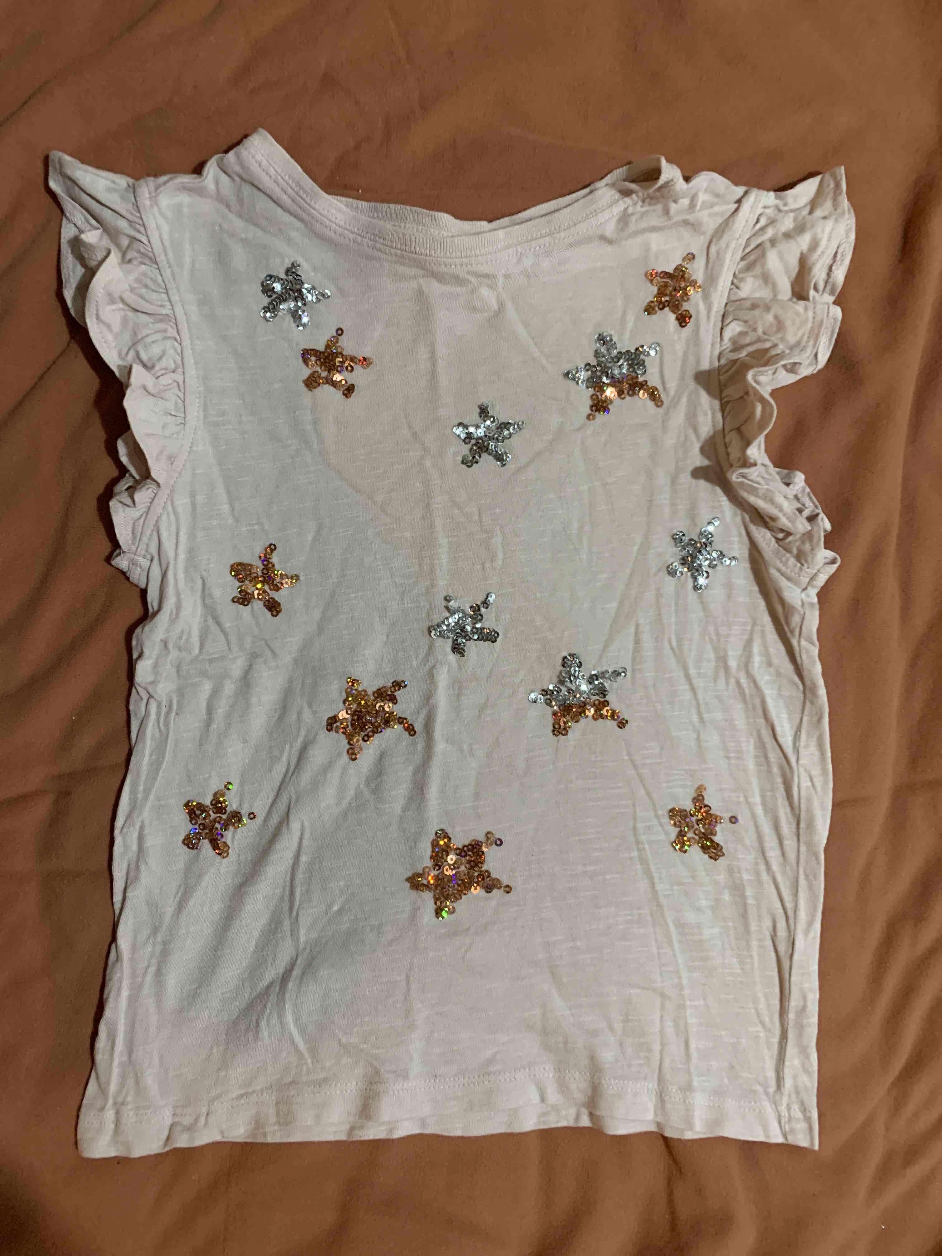 Polera blanca con estrellas de lentejuelas coloridas. Ideal para un look casual y divertido. Talla 8