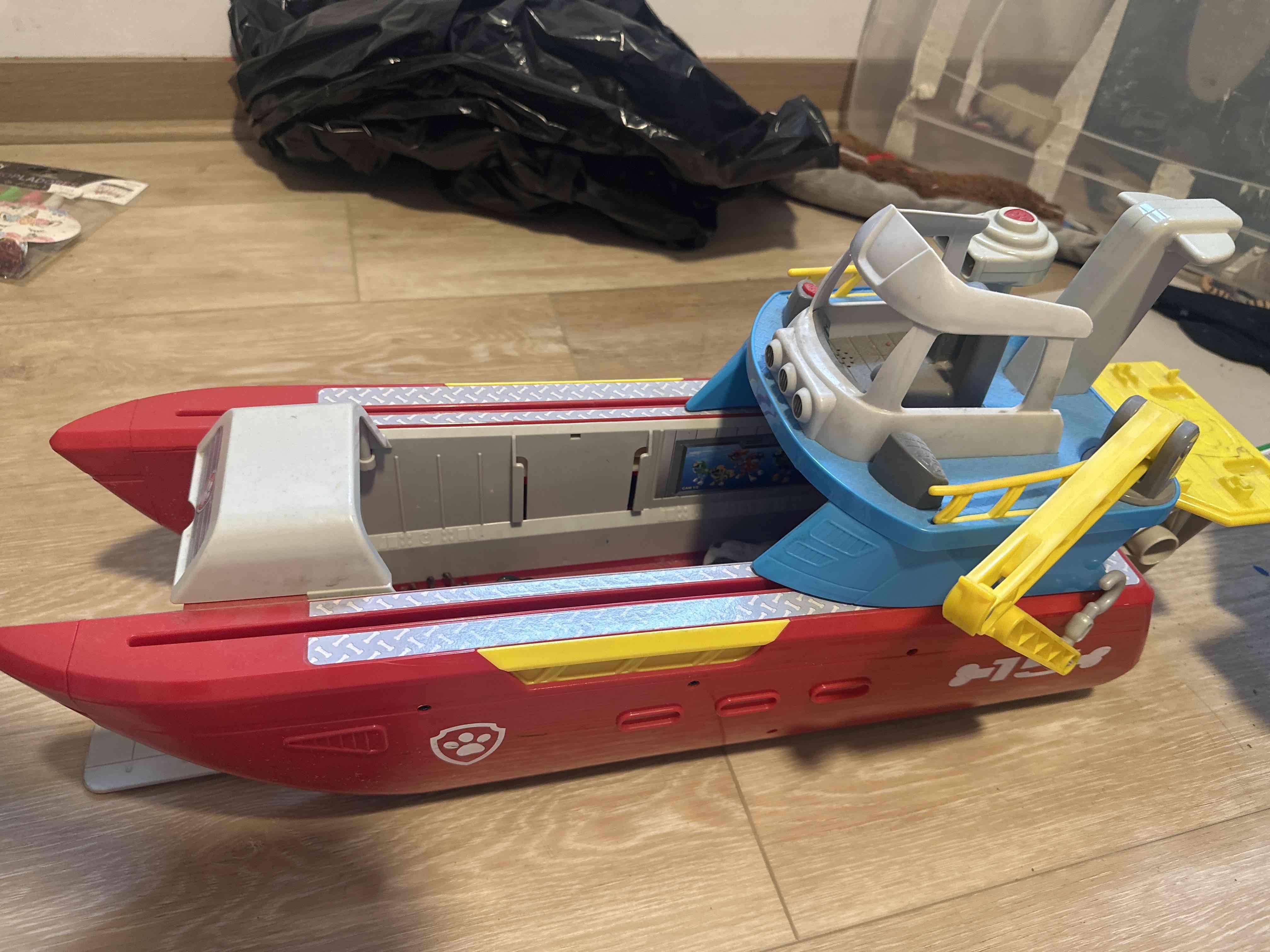 Barco de juguete colorido de Paw Patrol, ideal para aventuras imaginativas. En buen estado general.