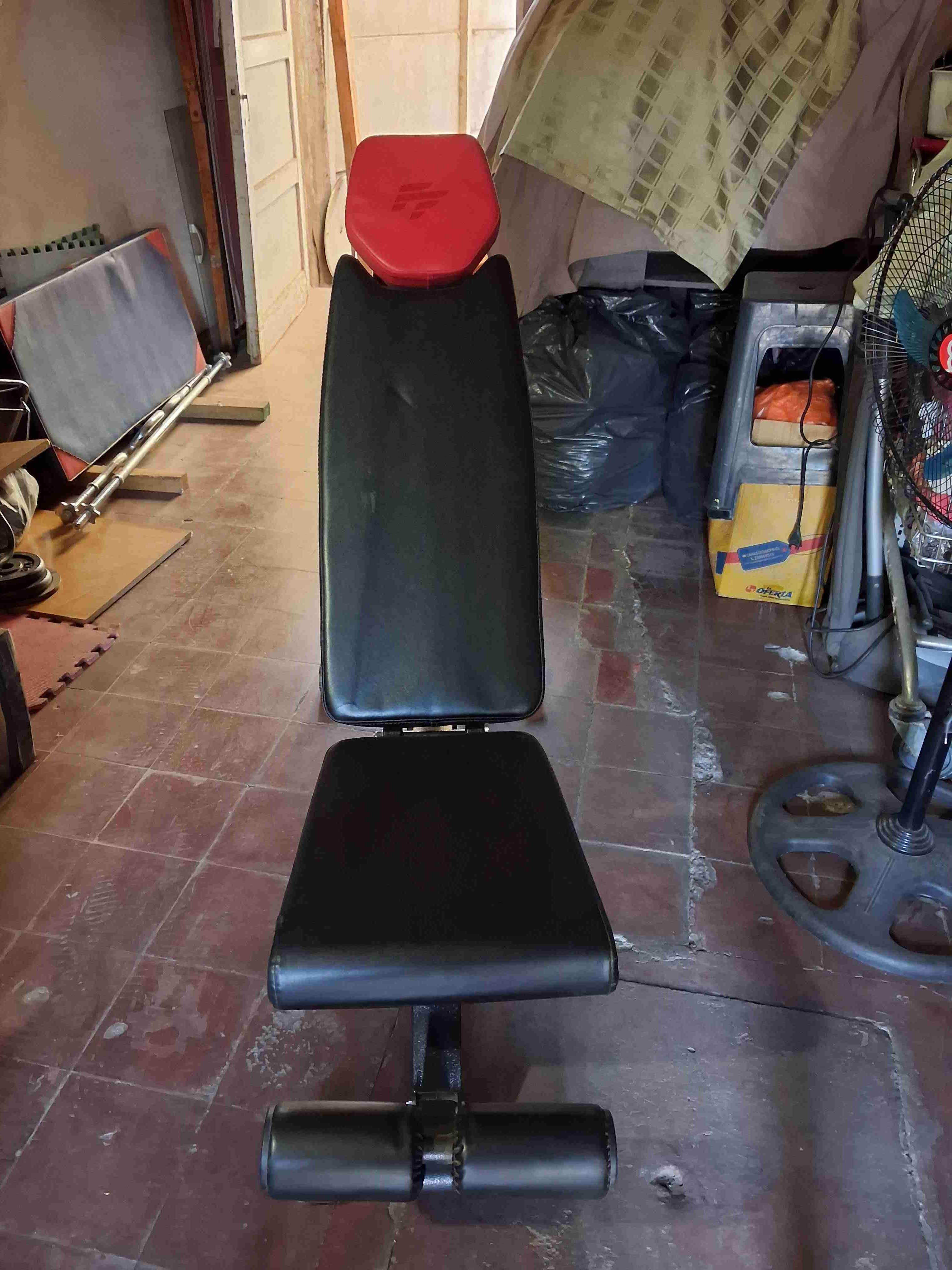 Banco de pesas en buen estado con asiento ajustable, ideal para entrenamientos en casa.