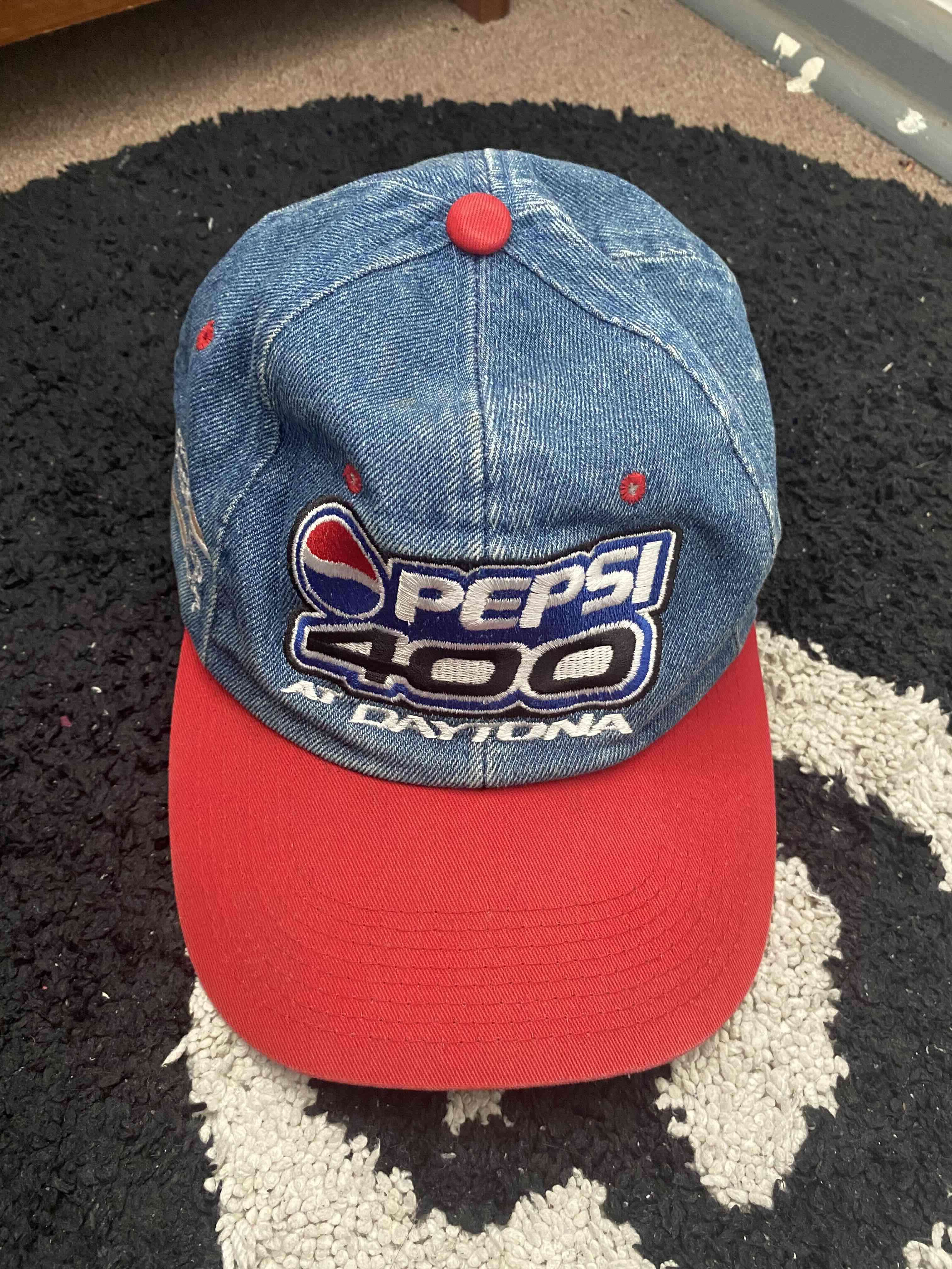 Gorra de mezclilla y visera roja con diseño Pepsi 400. Ideal para fanáticos de carreras. Buen estado general.