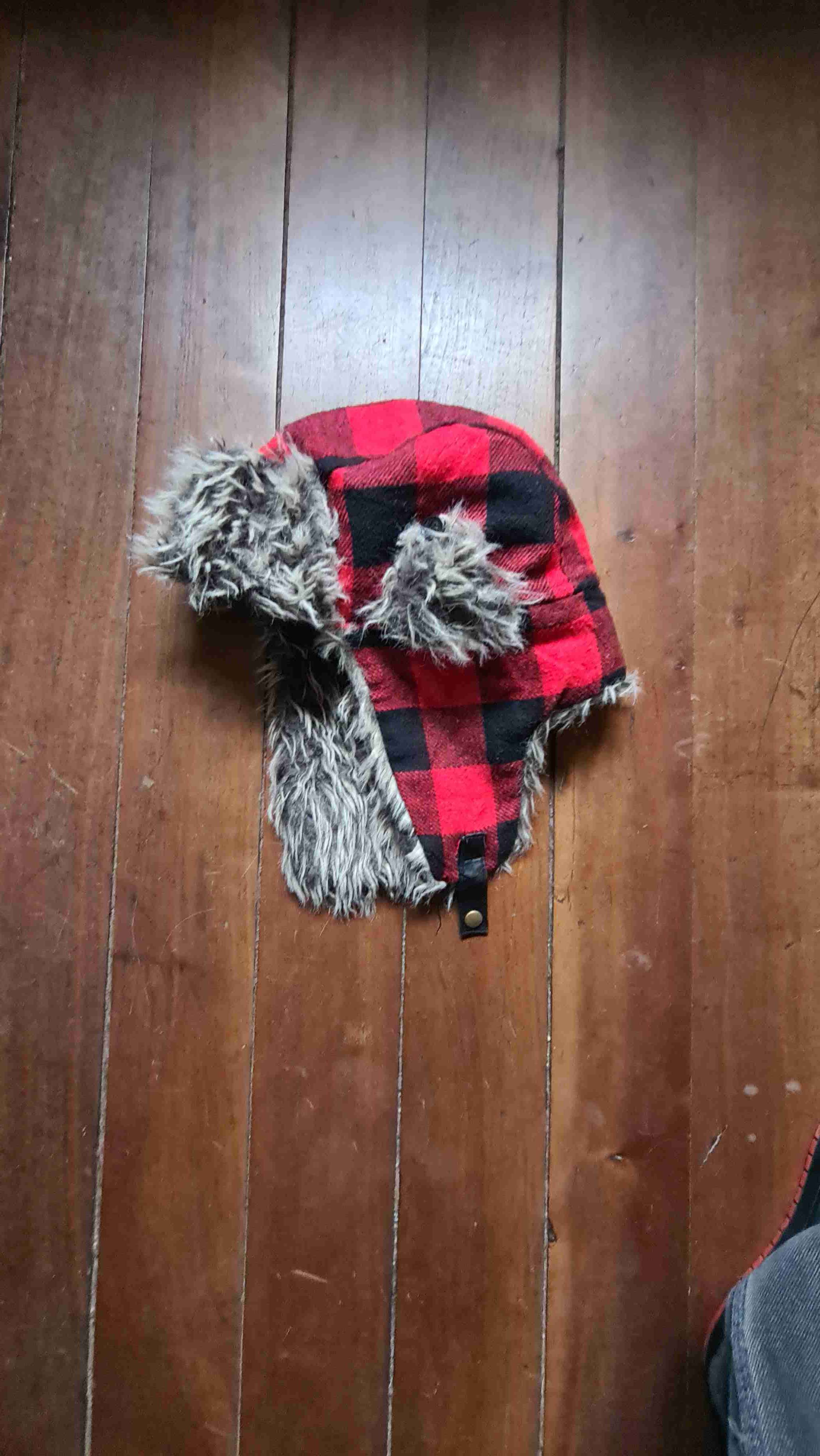 Gorro abrigado (2yk) con diseño de cuadros rojos y negros. Ideal para mantener la cabeza calentita en invierno. En buen estado general.