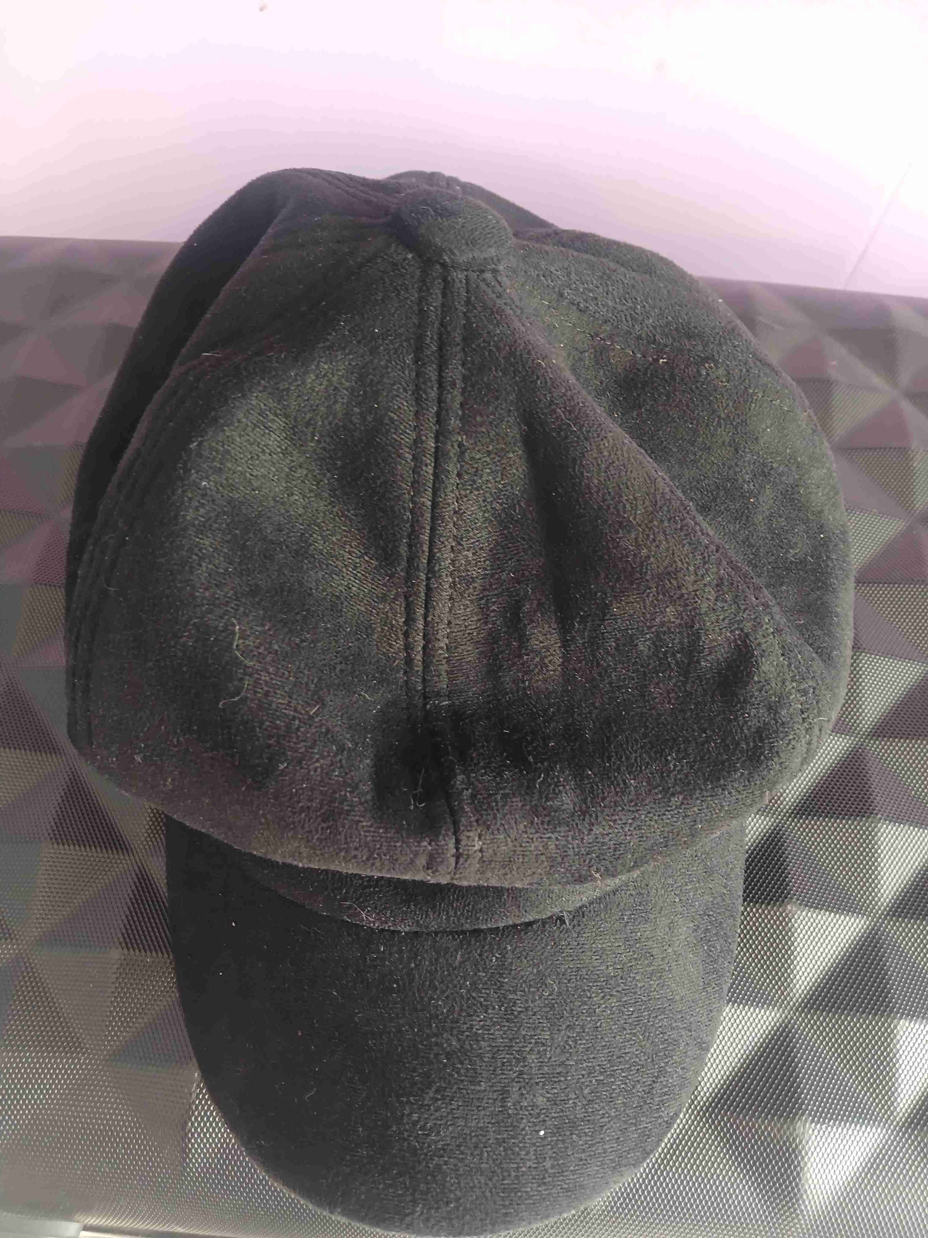 Gorro de gamuza en color negro, ideal para días fríos. En buen estado general con signos leves de uso.