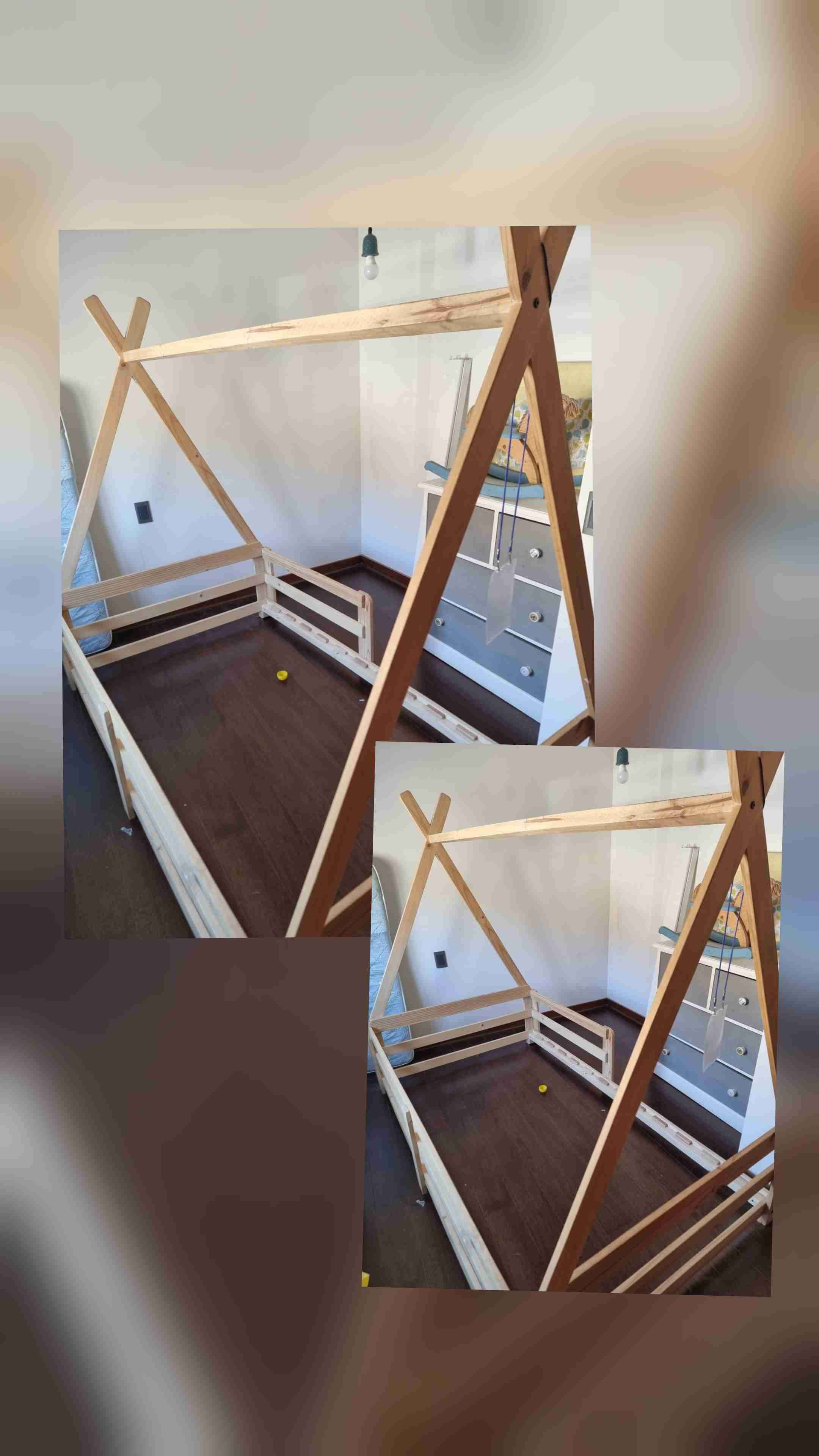 Cama de madera para niños en estilo tipi, en buen estado. Ideal para decorar y personalizar el espacio infantil.