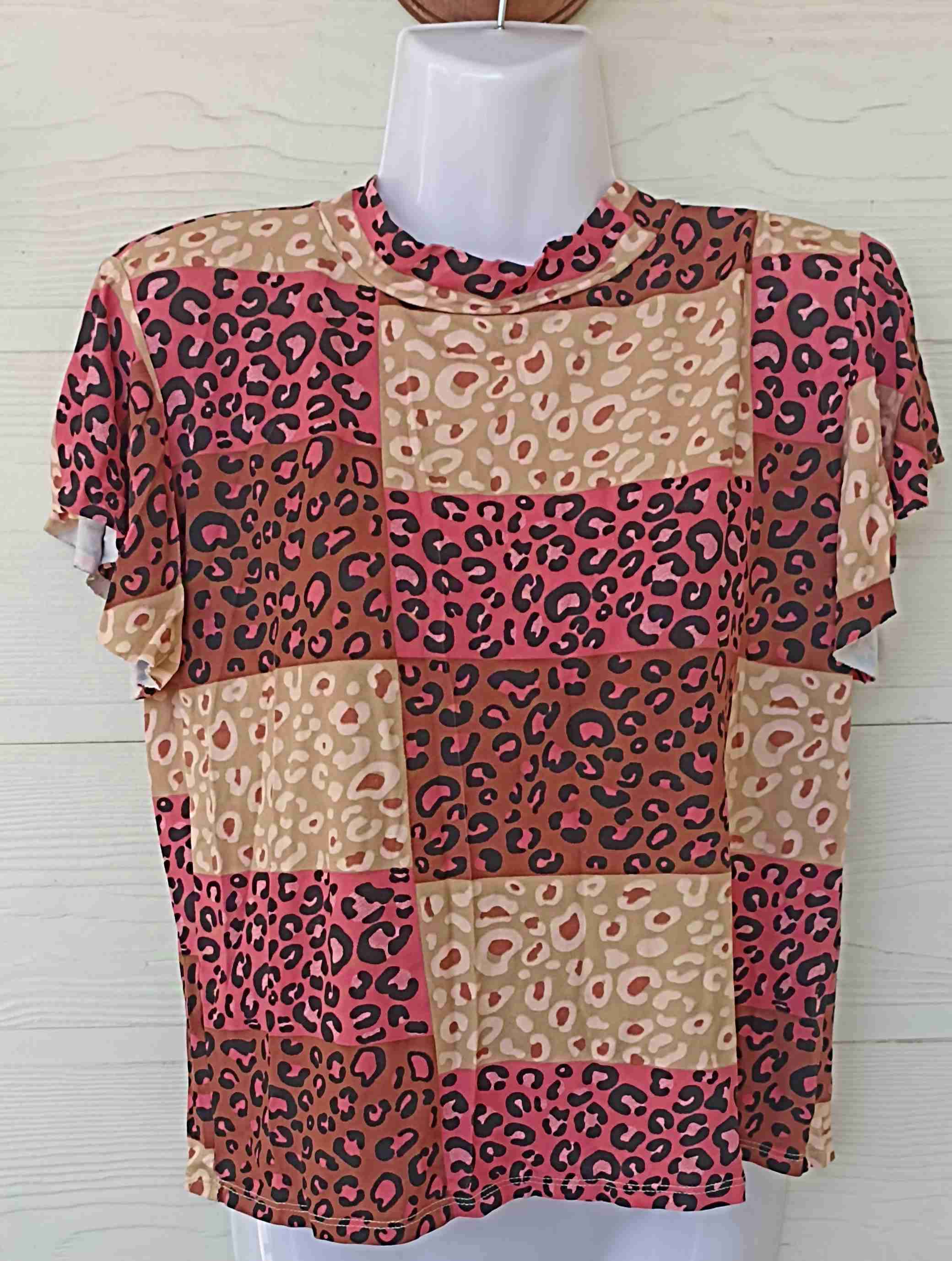Polera colorida con diseño de animal print en tonos tierra y rosado. Perfecta para un look casual. En buen estado.