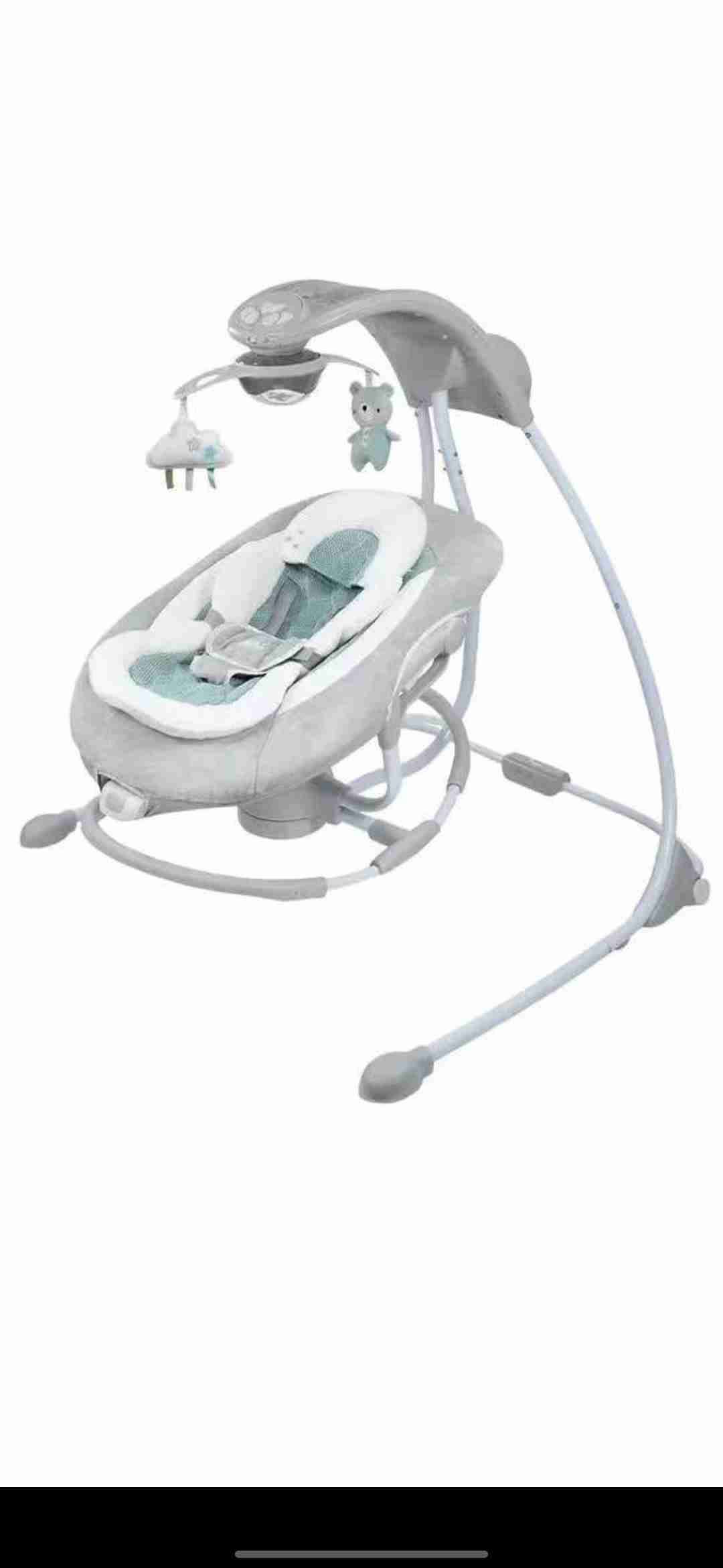 Suave columpio para bebé en tonos grises con juguetes colgantes. Ideal para calmar y entretener al bebé. Altavoces y ruido blanco mas naturaleza con disferentes velocidadades a bateria