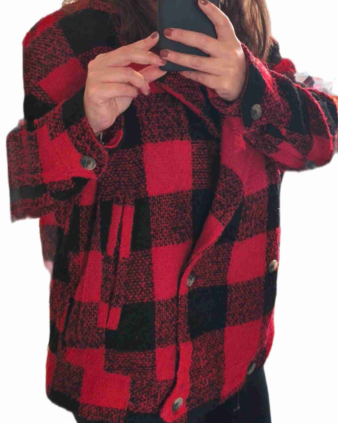 Chaqueta de lana roja y negra con diseño de cuadros, ideal para el invierno. Está en buen estado, perfecta para combinar con jeans.