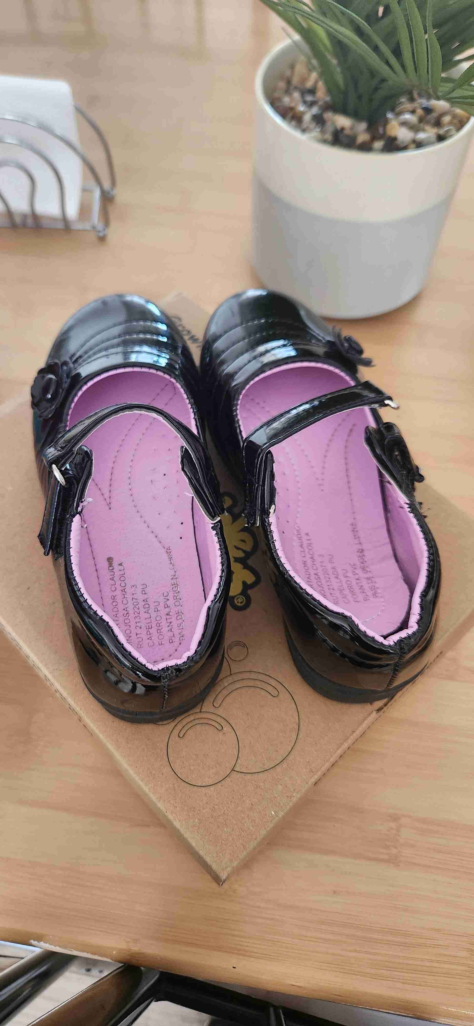 Elegantes zapatos de charol negro para niña, perfectos para ocasiones especiales. En buen estado, con leve uso. Incluyen un cierre de velcro lateral.