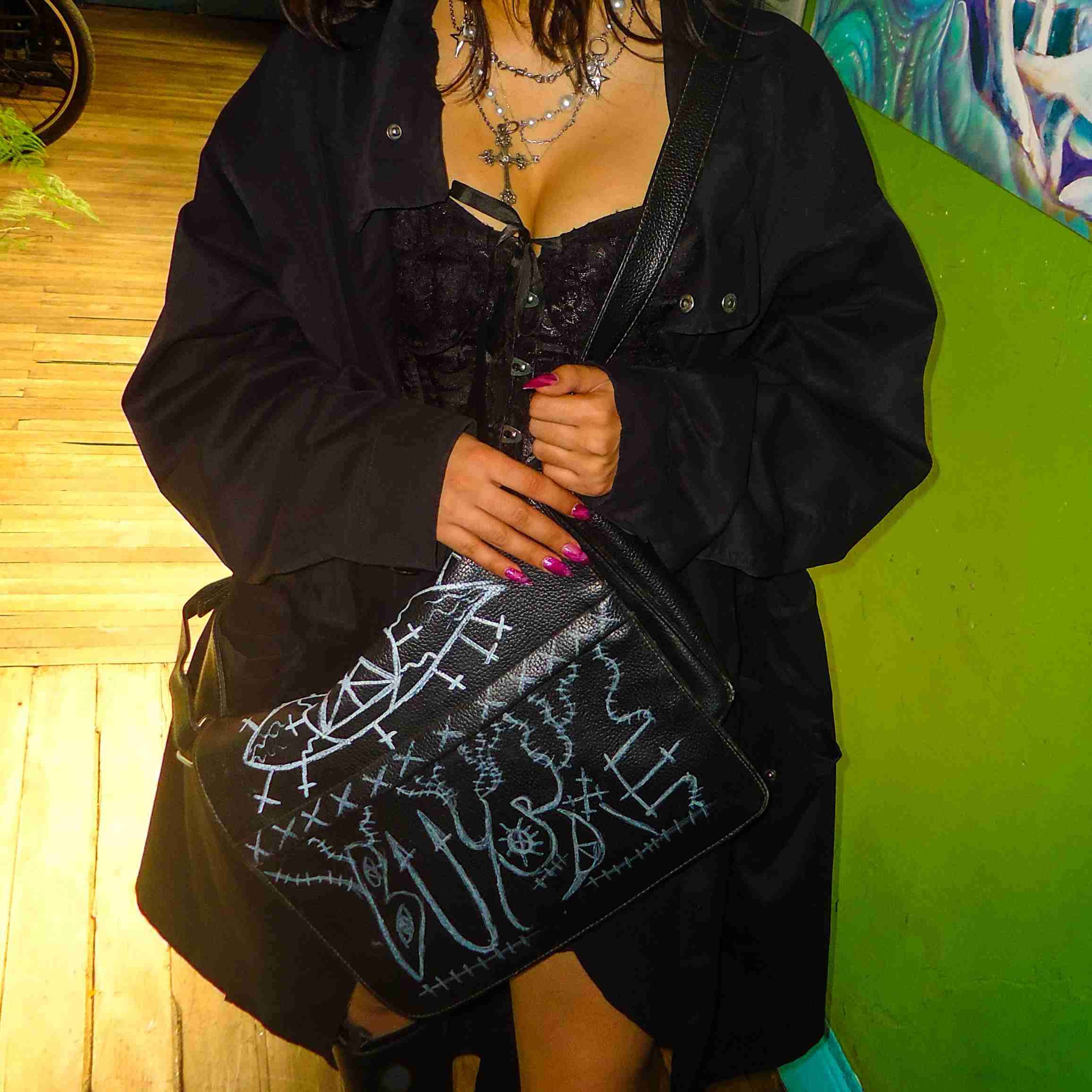 Cartera negra con diseño gráfico único. Perfecta para darle un toque especial a tu look diario.