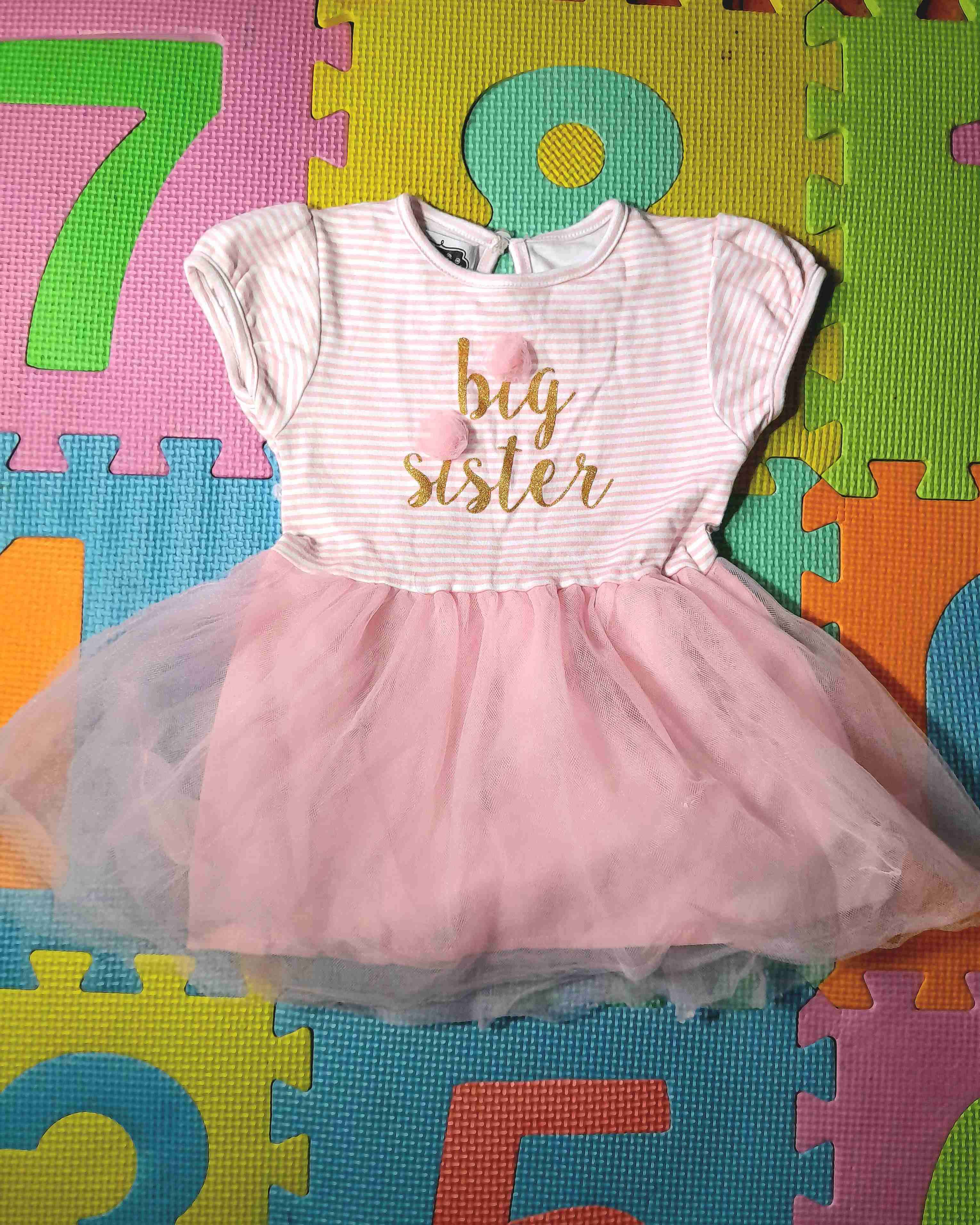 Vestido infantil en tonos rosados con la inscripción 'Big Sister'. Ideal para ocasiones especiales. En buen estado. Hasta 24 meses