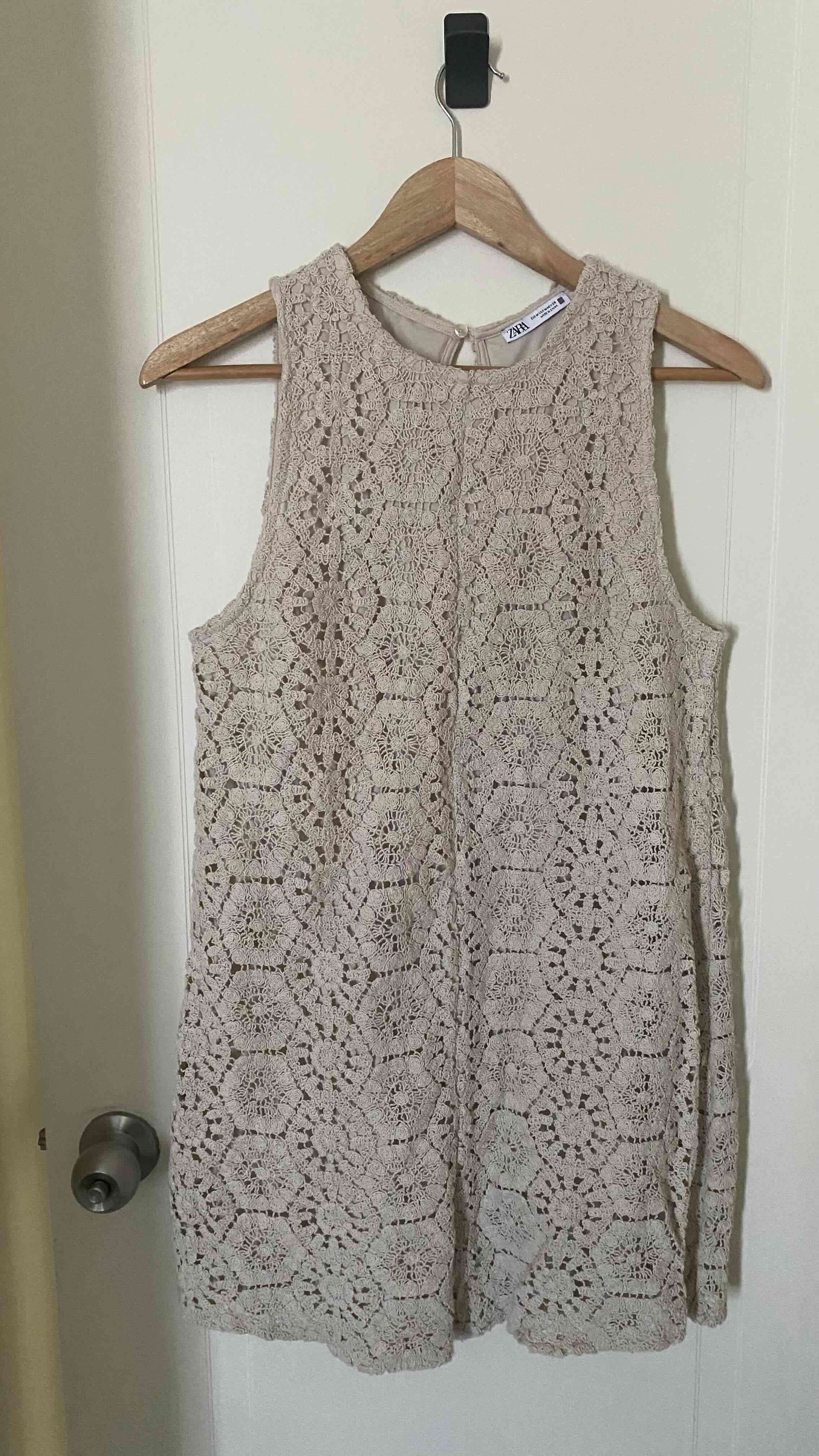 Enterito sin mangas de encaje en color beige, ideal para ocasiones elegantes. Buen estado, con detalles únicos en el tejido.