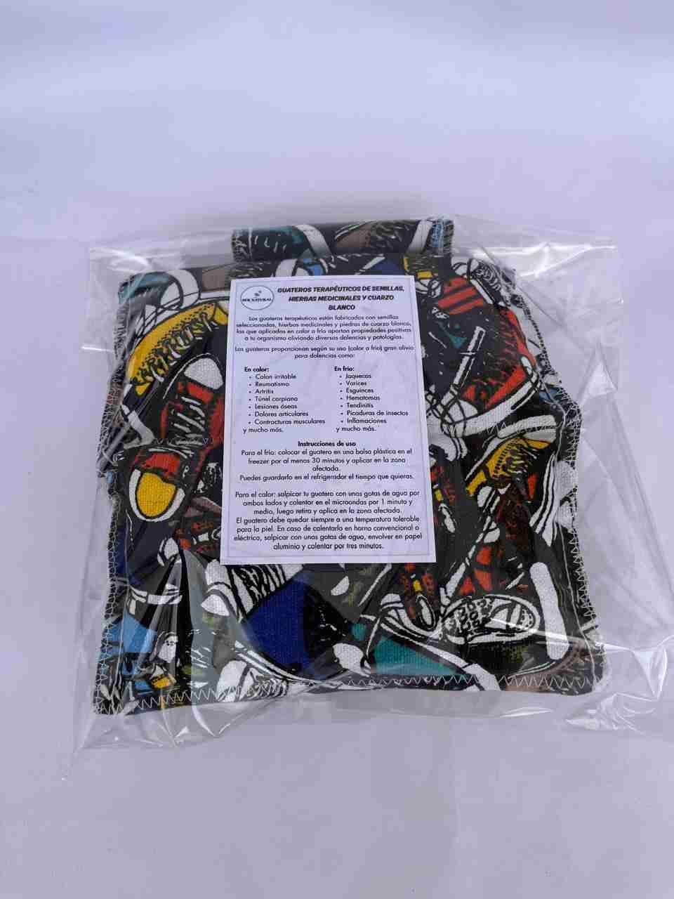 Guateros con diseño colorido, ideales para terapias térmicas. Usados para aliviar y aportar relajación. Formato cinturón para poder fijar en la zona.