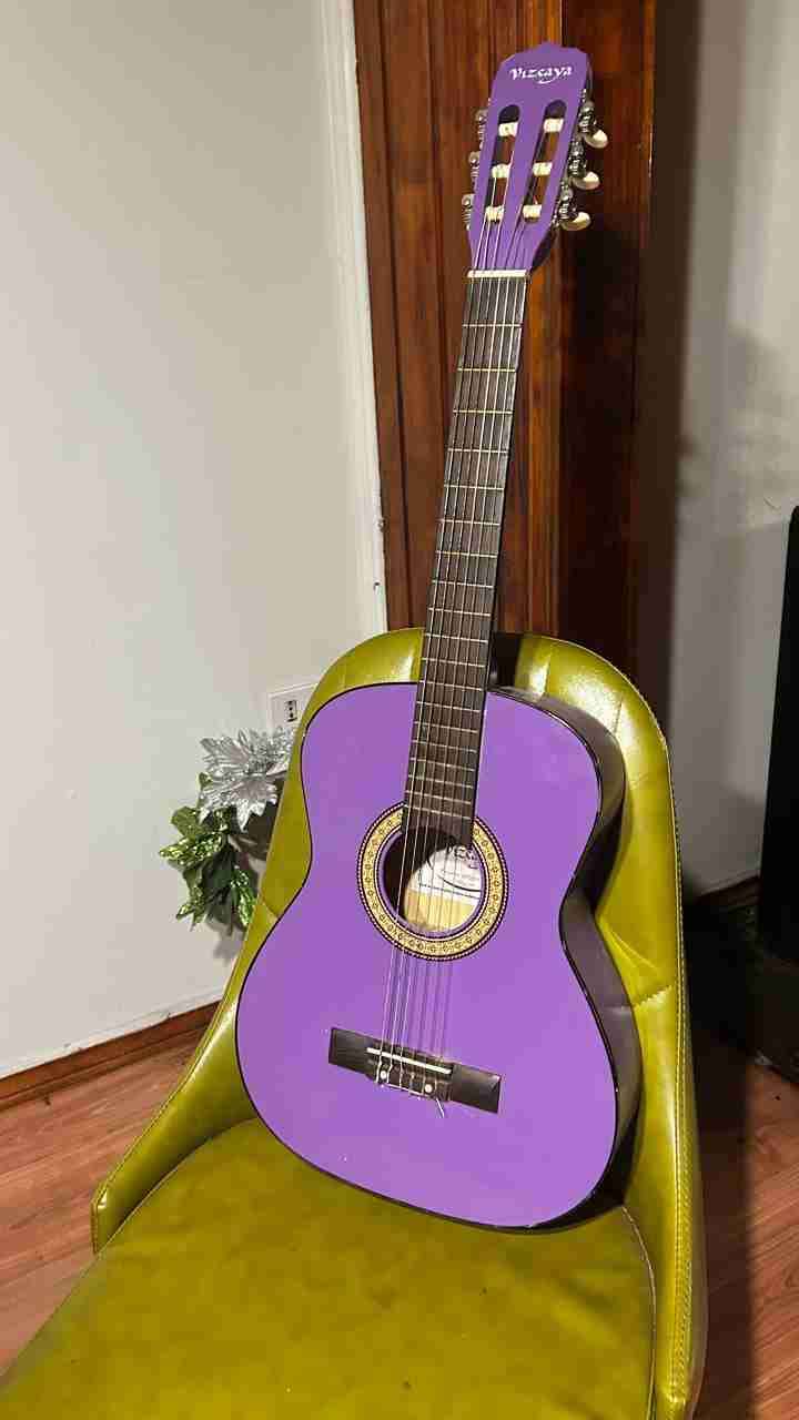 Hermosa guitarra acústica de color morado, ideal para principiantes. En buen estado, lista para tocar.