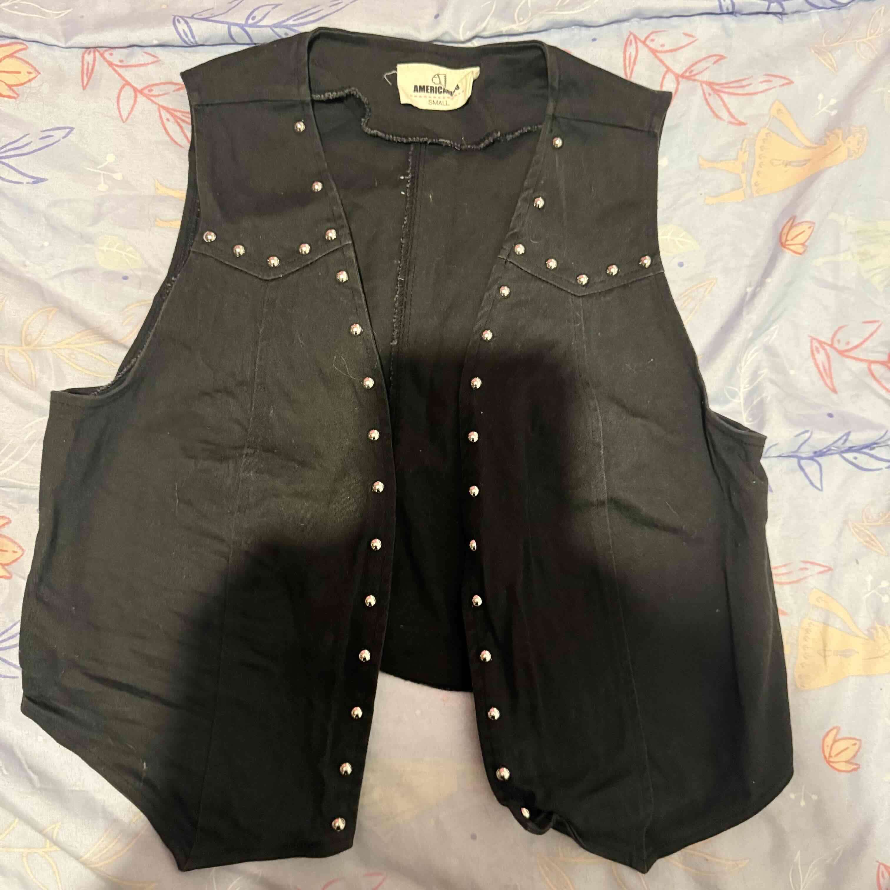 Chaleco negro con tachas plateadas, estilo casual perfecto para ocasiones informales. En buen estado general, ideal para complementar tu look diario.