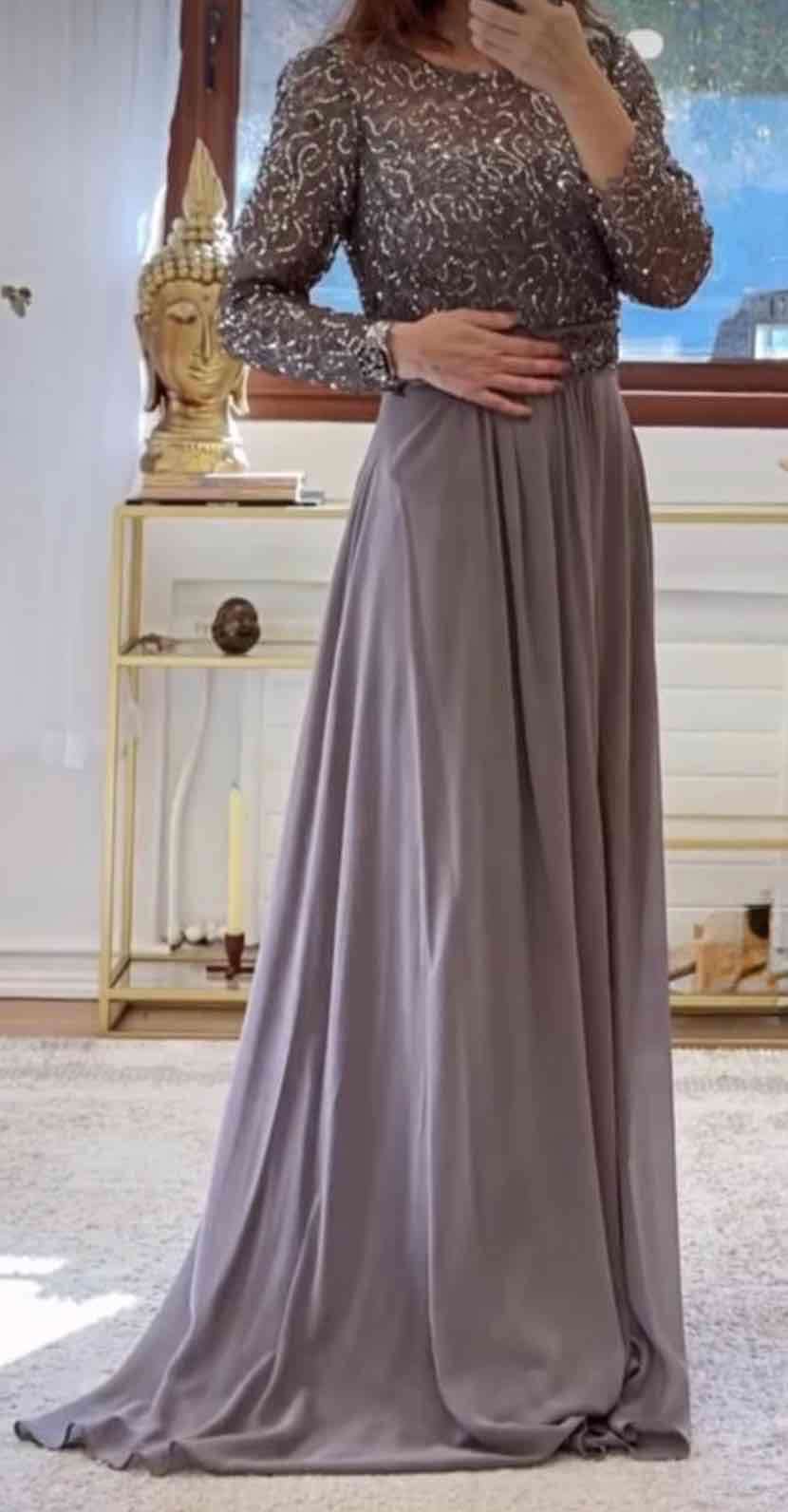 Elegante vestido largo de noche, color gris con detalles brillantes en el torso. Ideal para eventos de gala. Talla 36