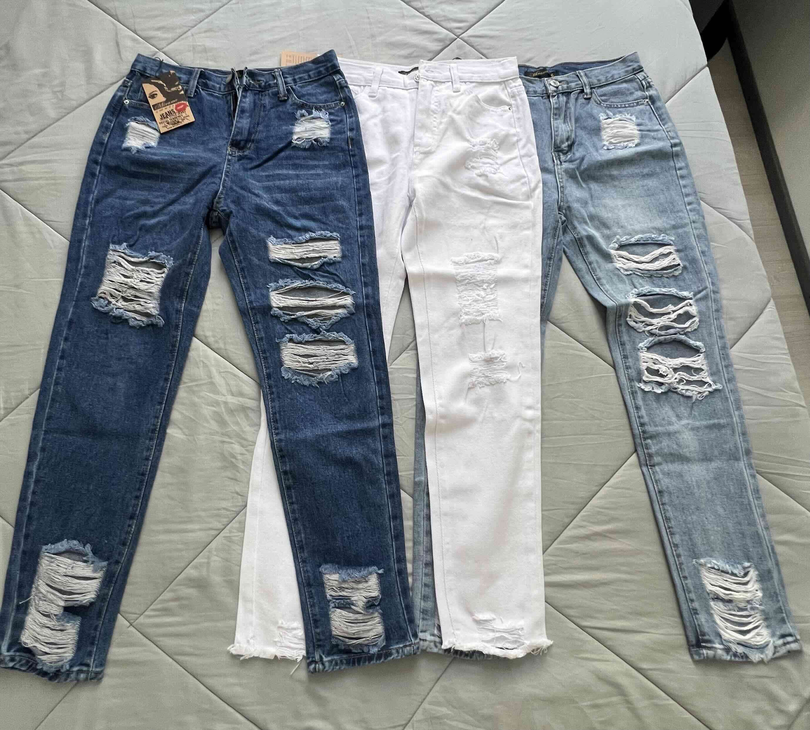 Jeans estilo desgastado, perfectos para un look casual y moderno. Vienen en azul oscuro, blanco y azul claro. ( se venden los 3 por $15.000.-)