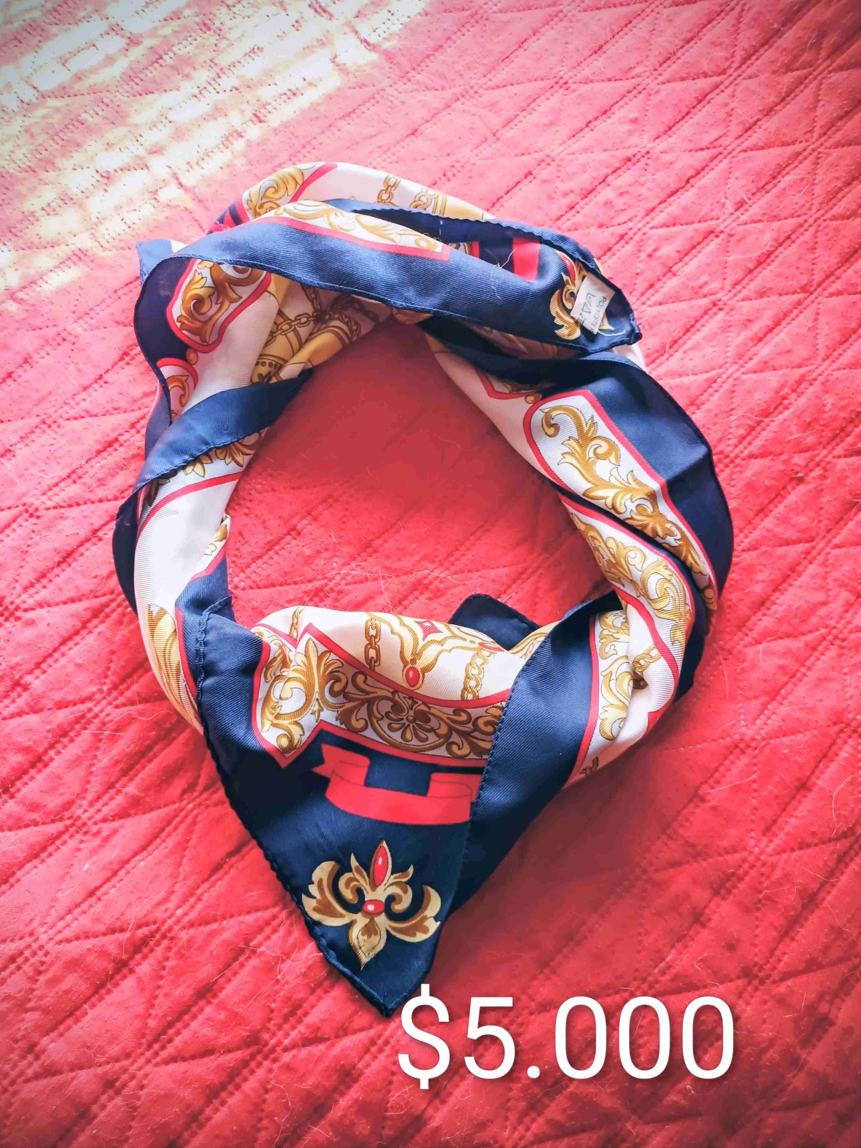 Pañuelo de tela con un diseño elegante en tonos azul y dorado. Perfecto para complementar tu look diario.