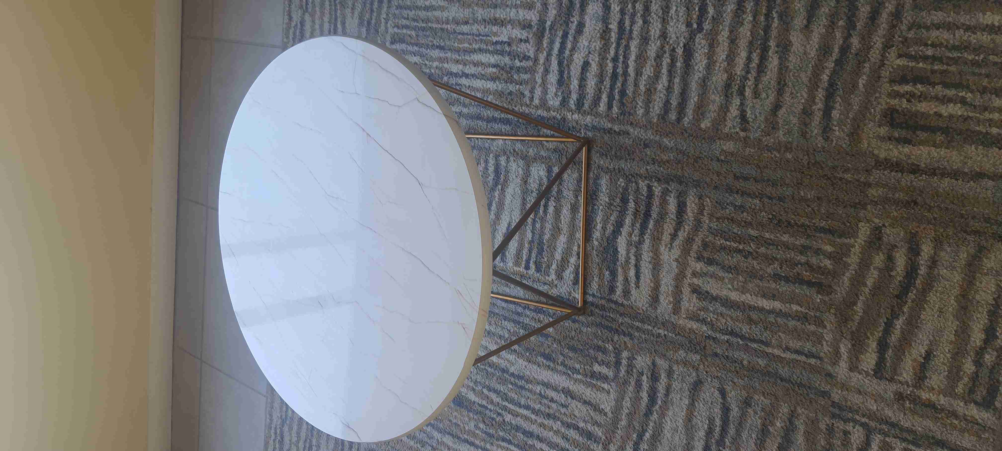 Elegante mesa de centro redonda con superficie blanca y patas de metal dorado. Ideal para sala de estar moderna. En buen estado.