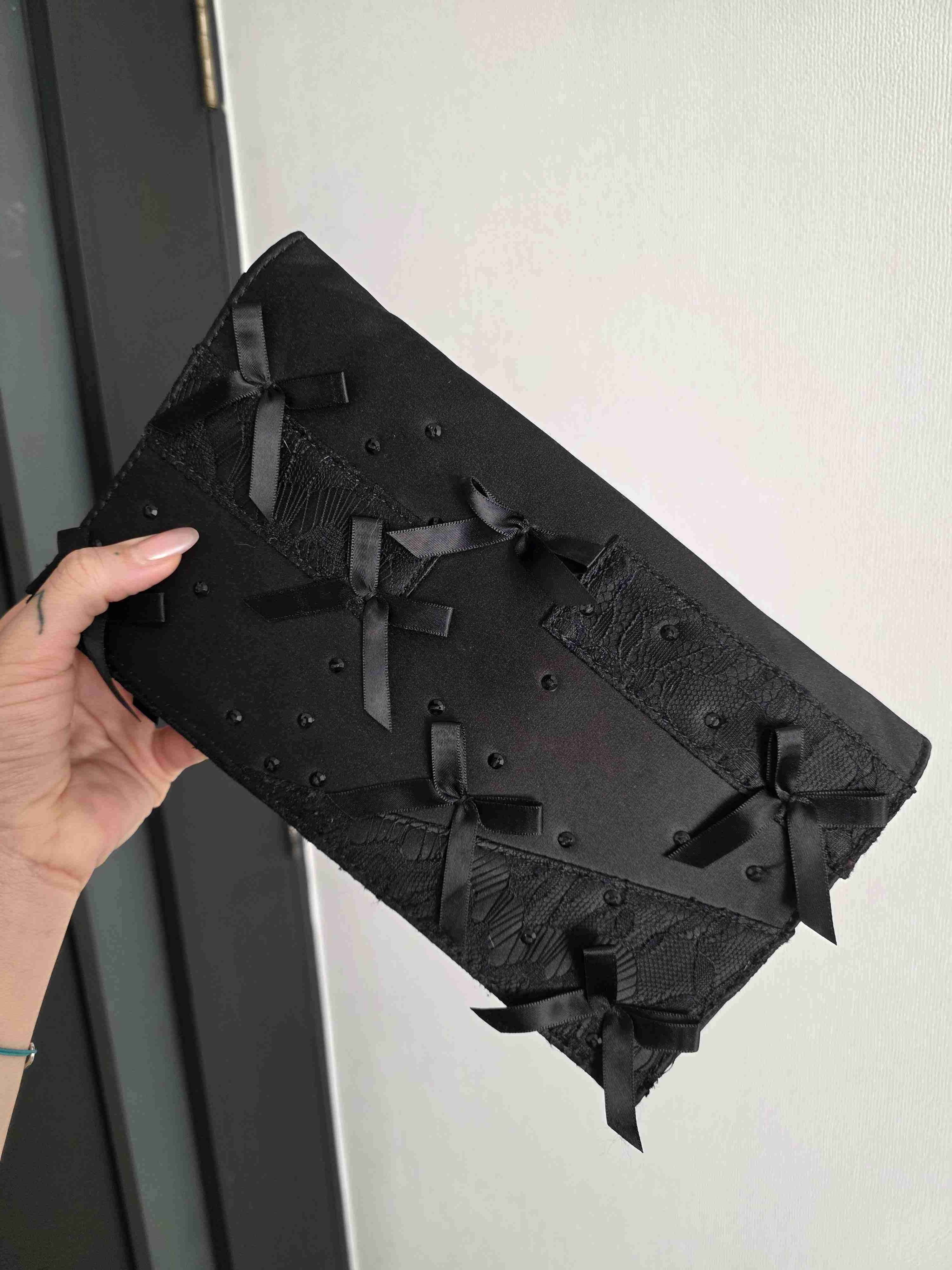 Elegante bolso de mano negro con detalles de lazos y encaje. Perfecto para eventos formales. En perfecto estado.