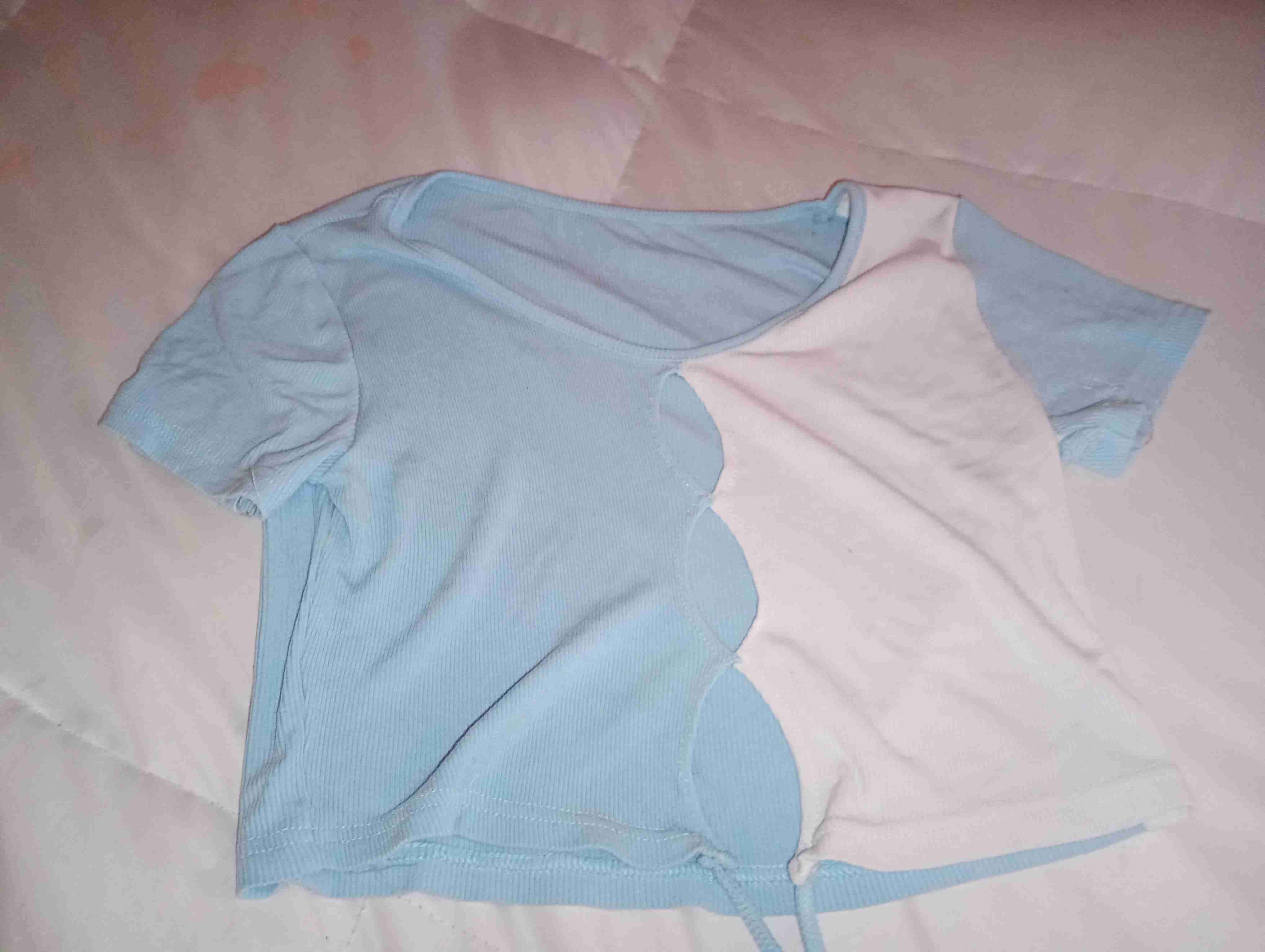 Polera corta con diseño bicolor en azul y blanco. Ideal para un look casual y fresco. En buen estado con leves signos de uso.