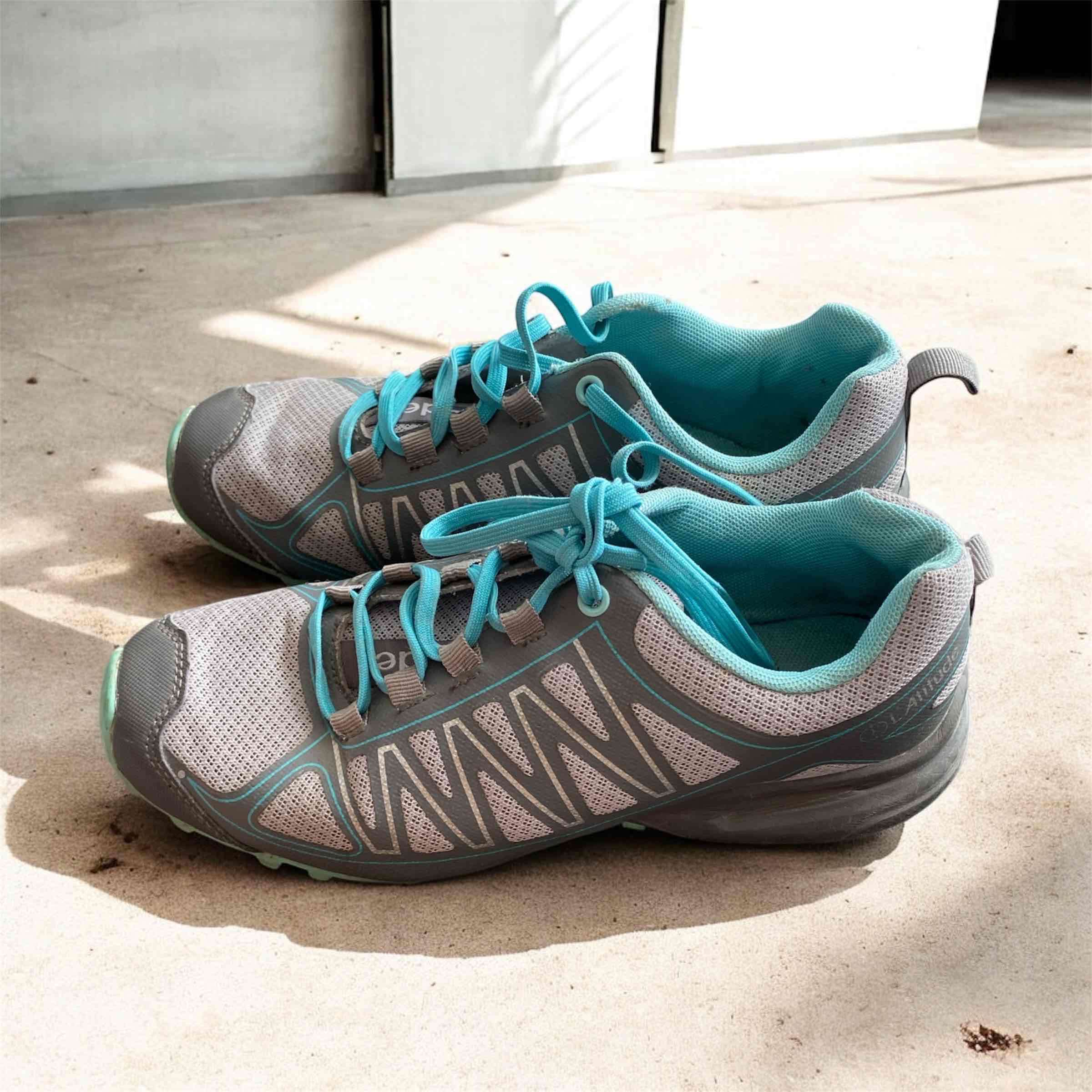 Zapatillas deportivas en buen estado, ideales para caminar, treking o actividad física. Color gris con detalles celestes.