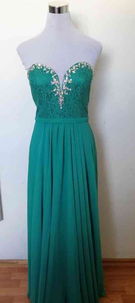 Vestido largo verde con detalles en el busto, ideal para eventos formales. En buen estado. Talla M