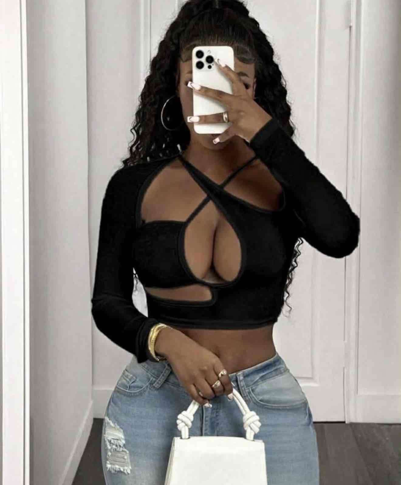 Top estilo moderno y atrevido en color negro, ideal para salidas nocturnas. Buen estado general.