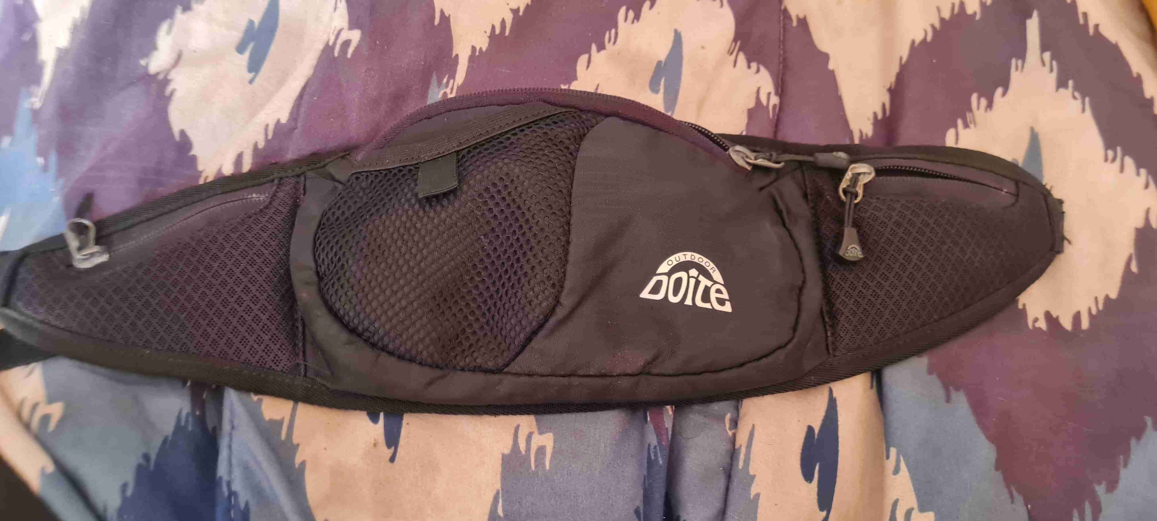 Riñonera negra ideal para actividades al aire libre, en buen estado, con varios compartimentos. Perfecta para caminatas y viajes.