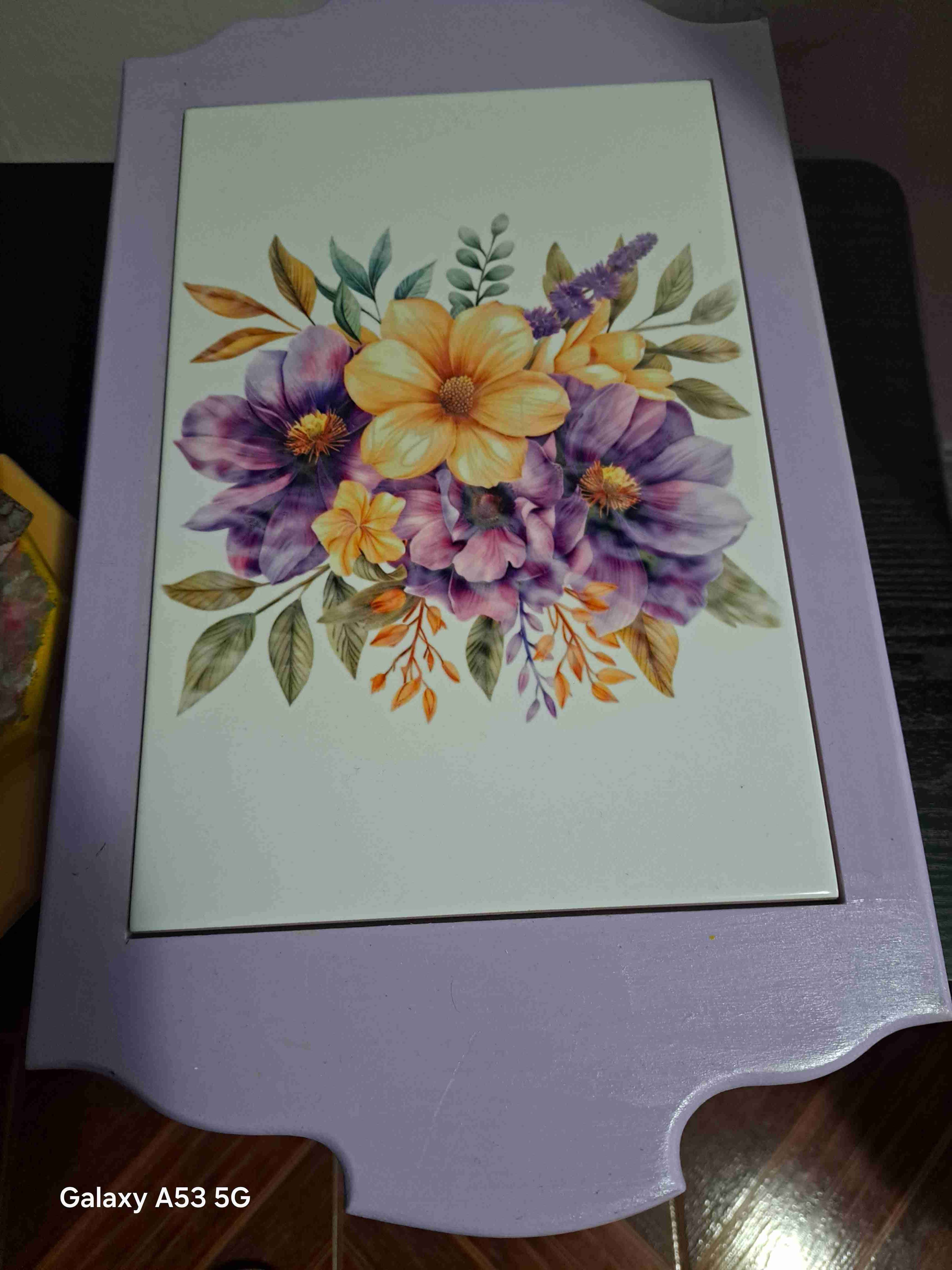 Cuadro con diseño floral colorido sobre base de madera pintada. Ideal para decorar interiores Bandeja gatos yflores $15000,Tornamesa 30cm.$20.000 ,Bandeja de pajaritos $6000,servilletero $4000 y caja $7000. Todo muy lindo y con dedicacion
