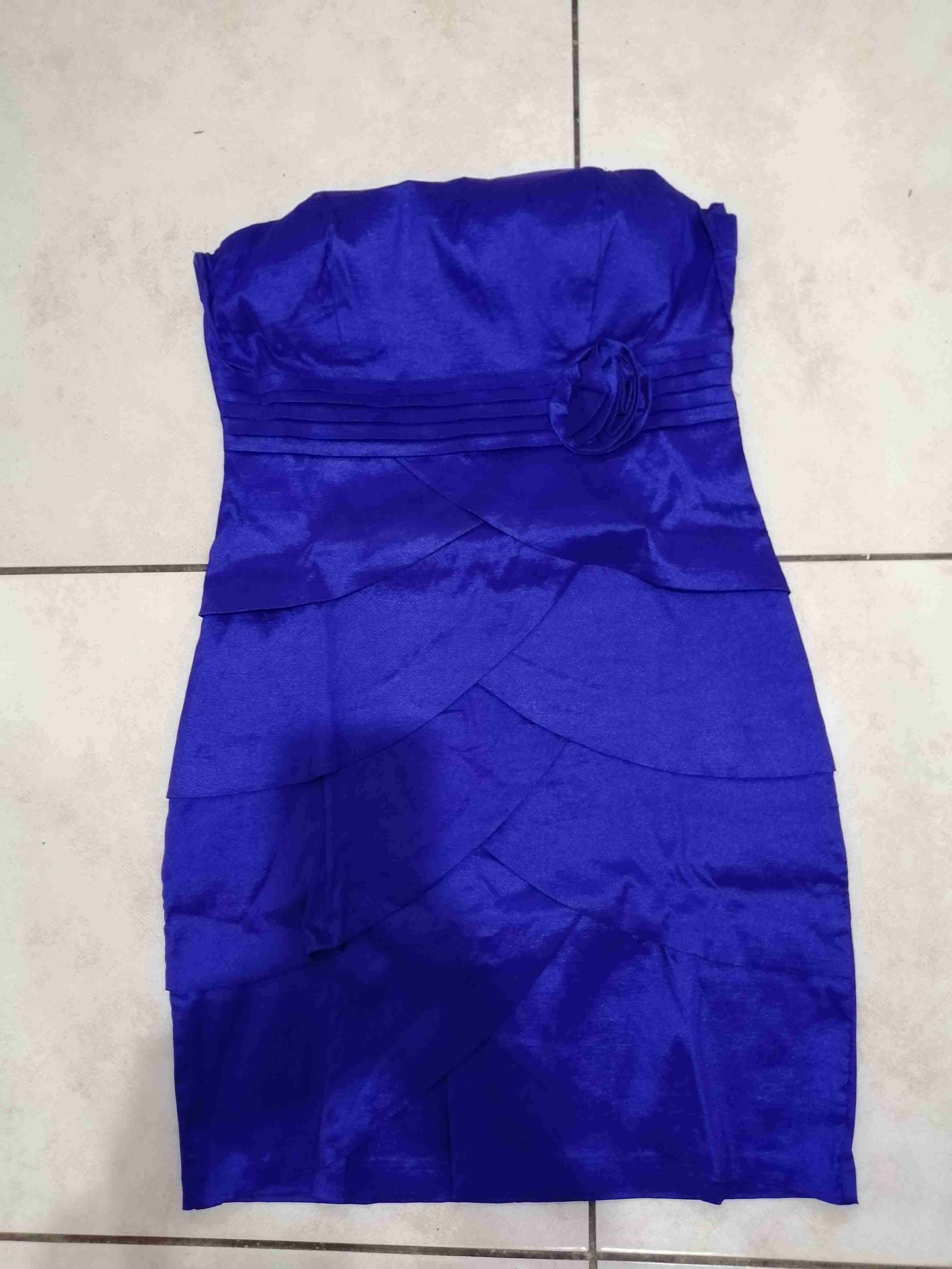 Vestido strapless azul brillante con detalle de flor. Perfecto para fiestas. Buen estado.
